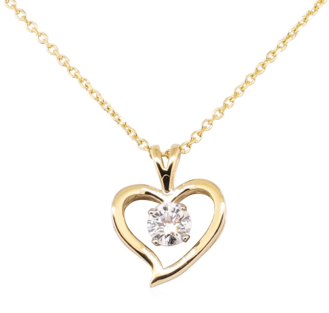 One heart shaped pendant with chain featuring: 14KT yellow gold weighing 2.8 grams containing one diamond weighing 0.40ct. The featured pendant has an attached sixteen inch long 1.1mm diamond cut oval cable link chain.