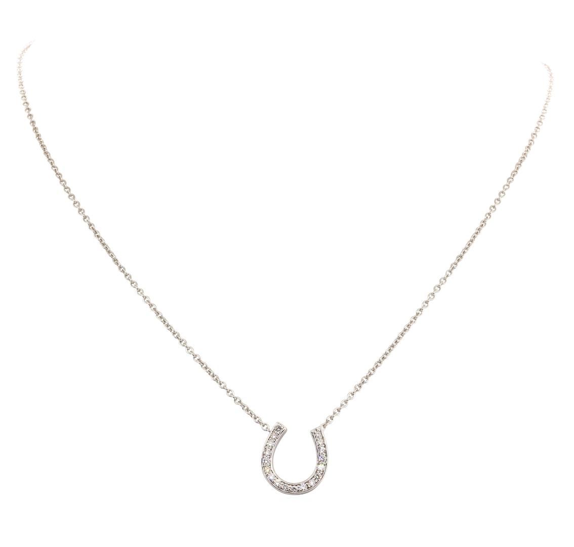 One pendant with a sixteen inch long 1.5mm wide rounded cable link chain featuring: 14KT white gold weighing 4.3 grams containing diamonds weighing 0.40ctw.