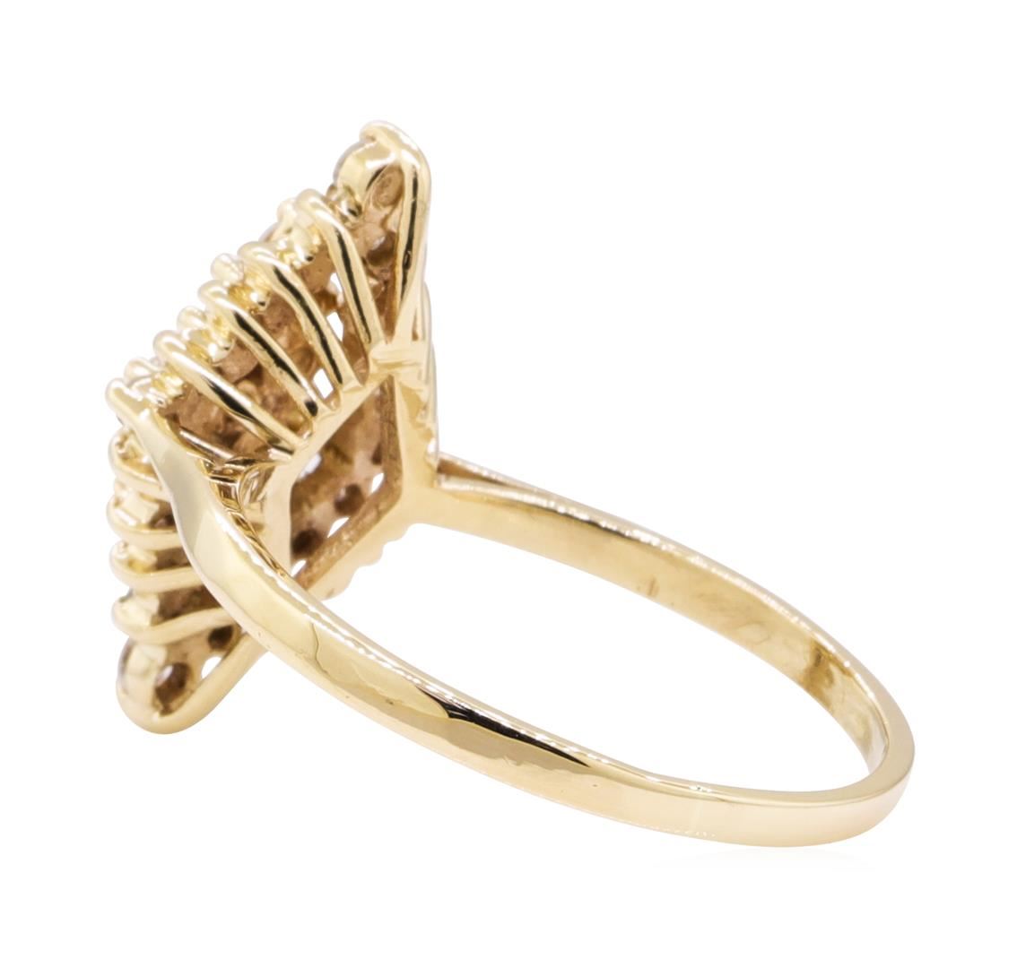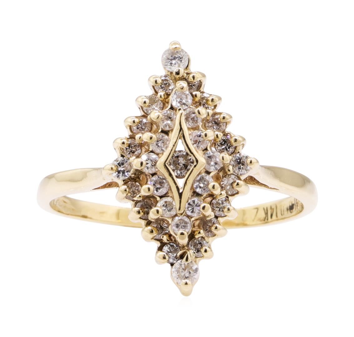 One lady's ring with a diamond shaped motif with a wire basket setting featuring: 14KT yellow gold weighing 3.5 grams containing diamonds weighing 0.40ctw.