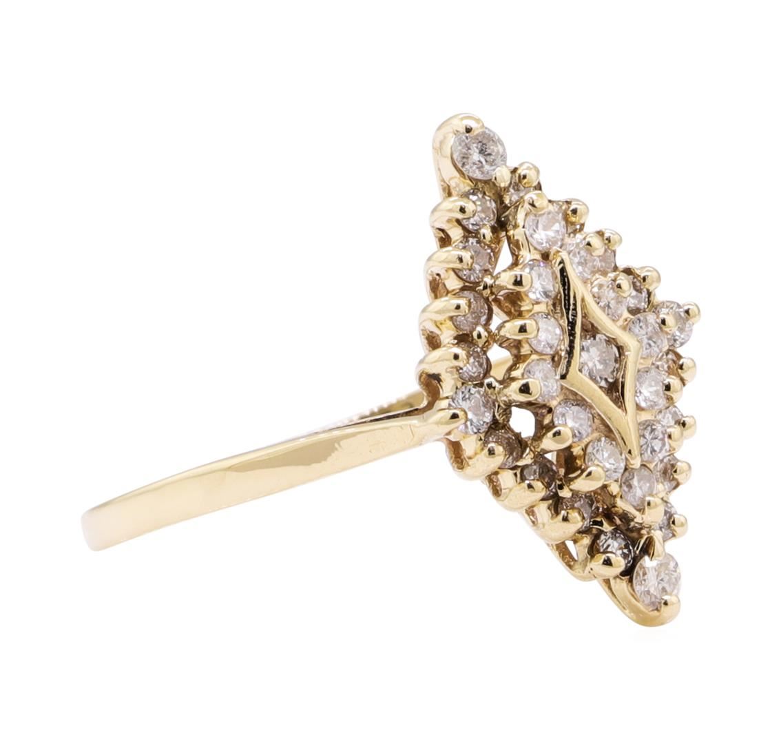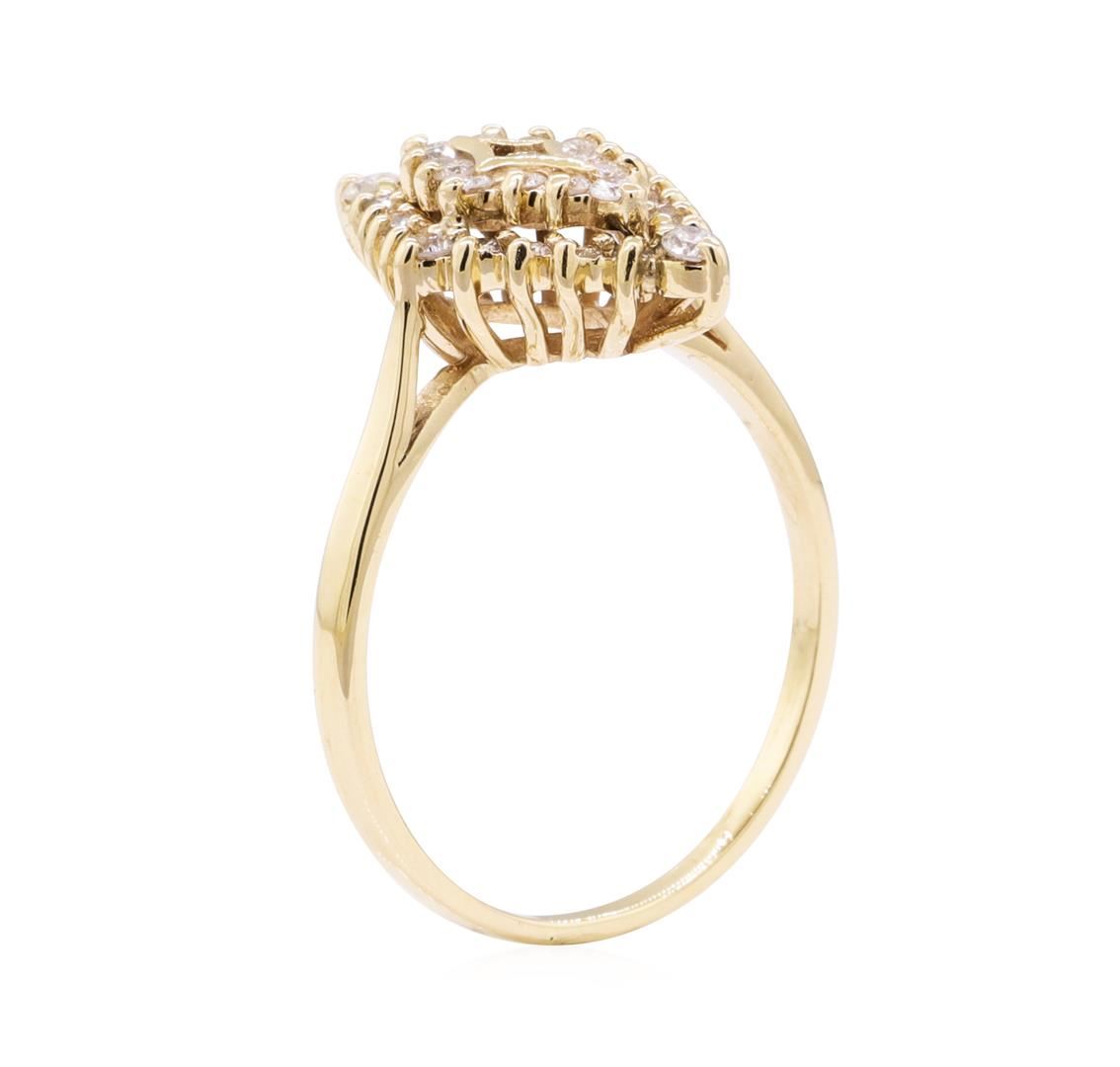 One lady's ring with a diamond shaped motif with a wire basket setting featuring: 14KT yellow gold weighing 3.5 grams containing diamonds weighing 0.40ctw.