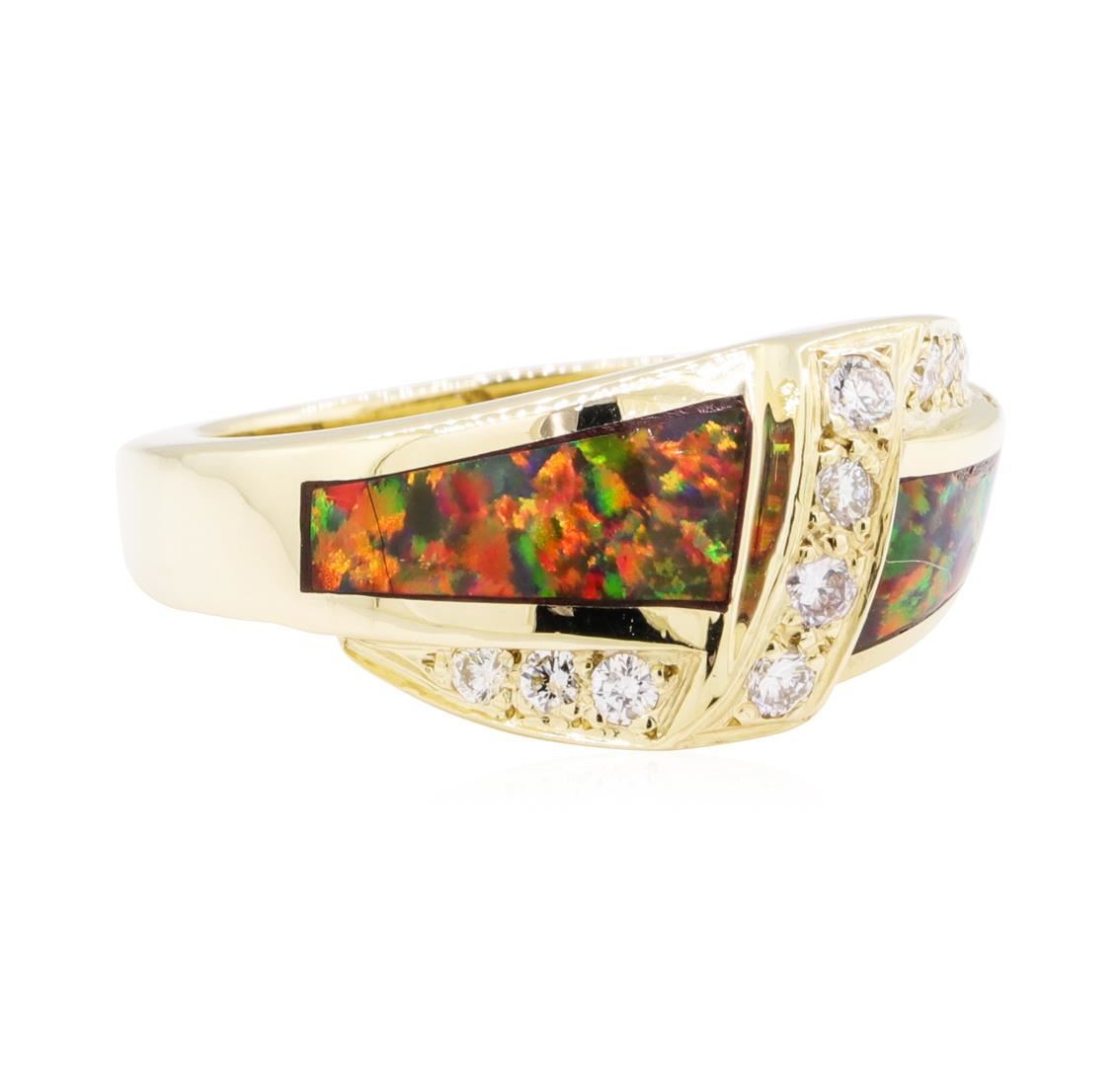One lady's ring featuring: 14KT yellow gold weighing 7.3 grams containing diamonds weighing 0.40ctw and inlaid synthetic opal.