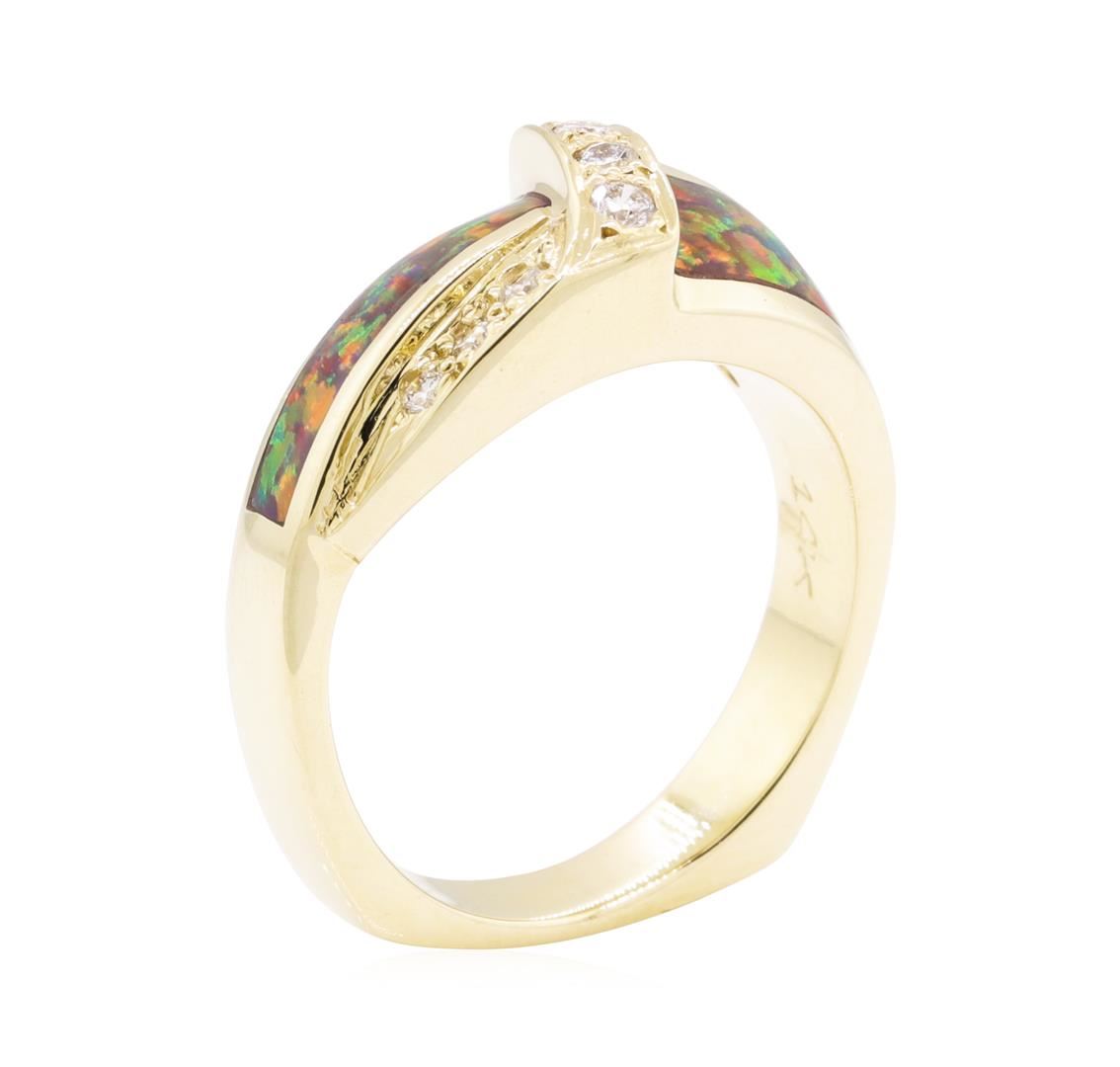 One lady's ring featuring: 14KT yellow gold weighing 7.3 grams containing diamonds weighing 0.40ctw and inlaid synthetic opal.