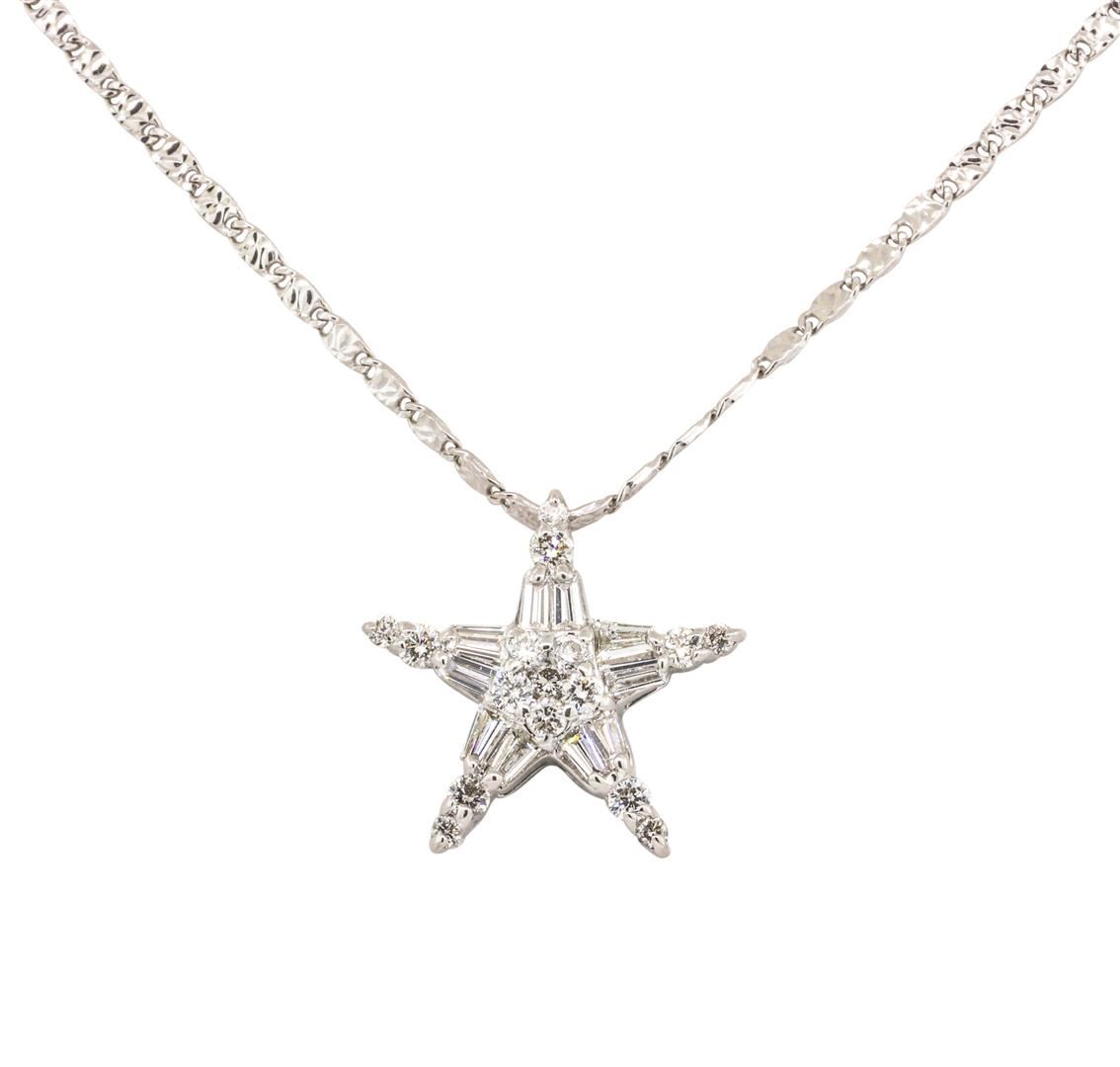 One star shaped pendant with an eighteen inch long 1.2mm wide snail chain featuring: 14KT white gold weighing 2.9 grams containing diamonds weighing 0.40ctw.