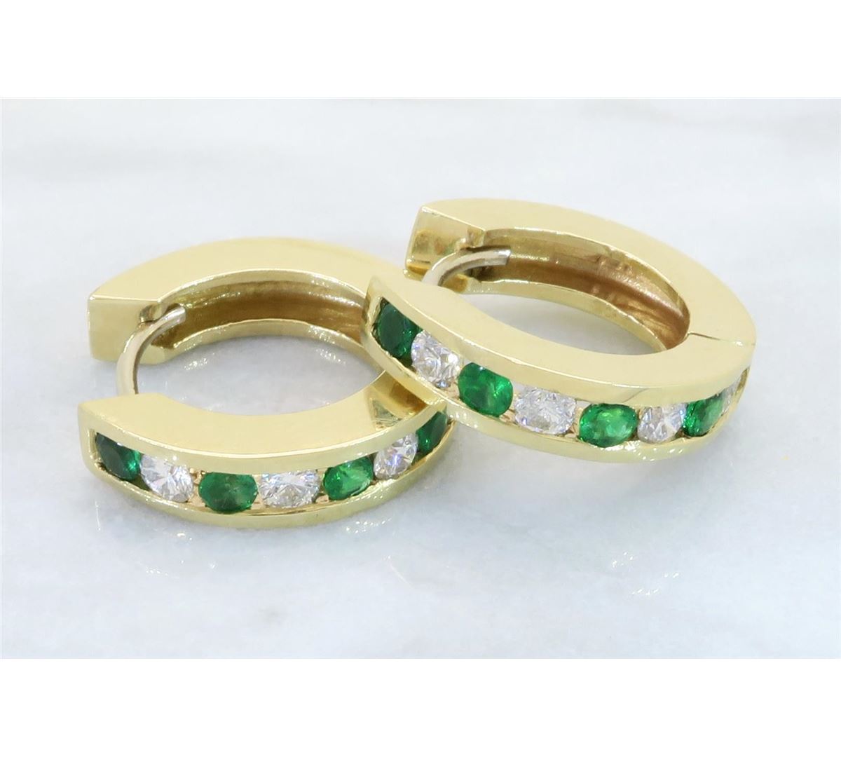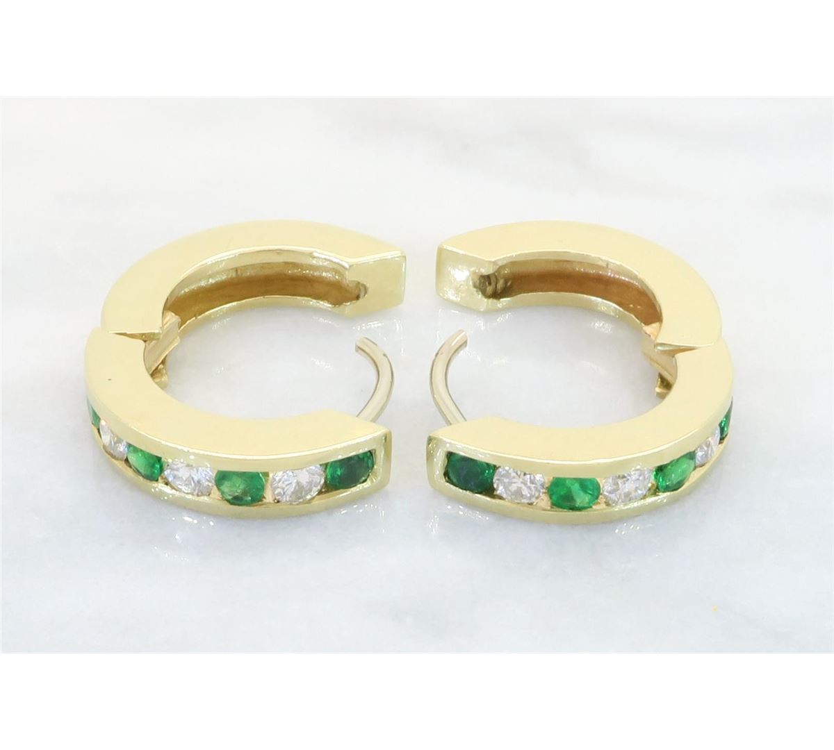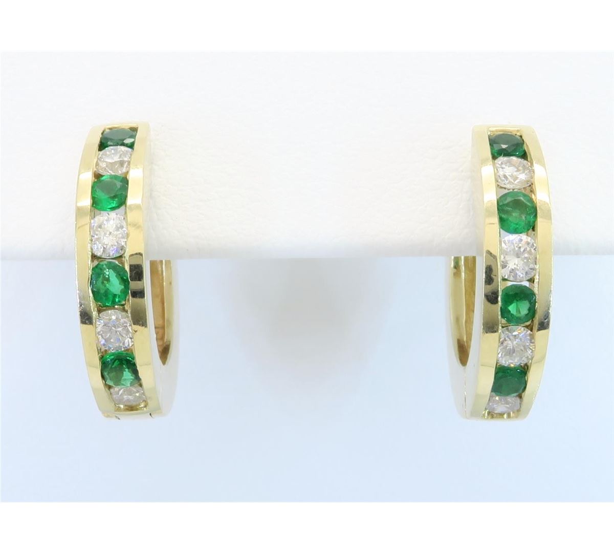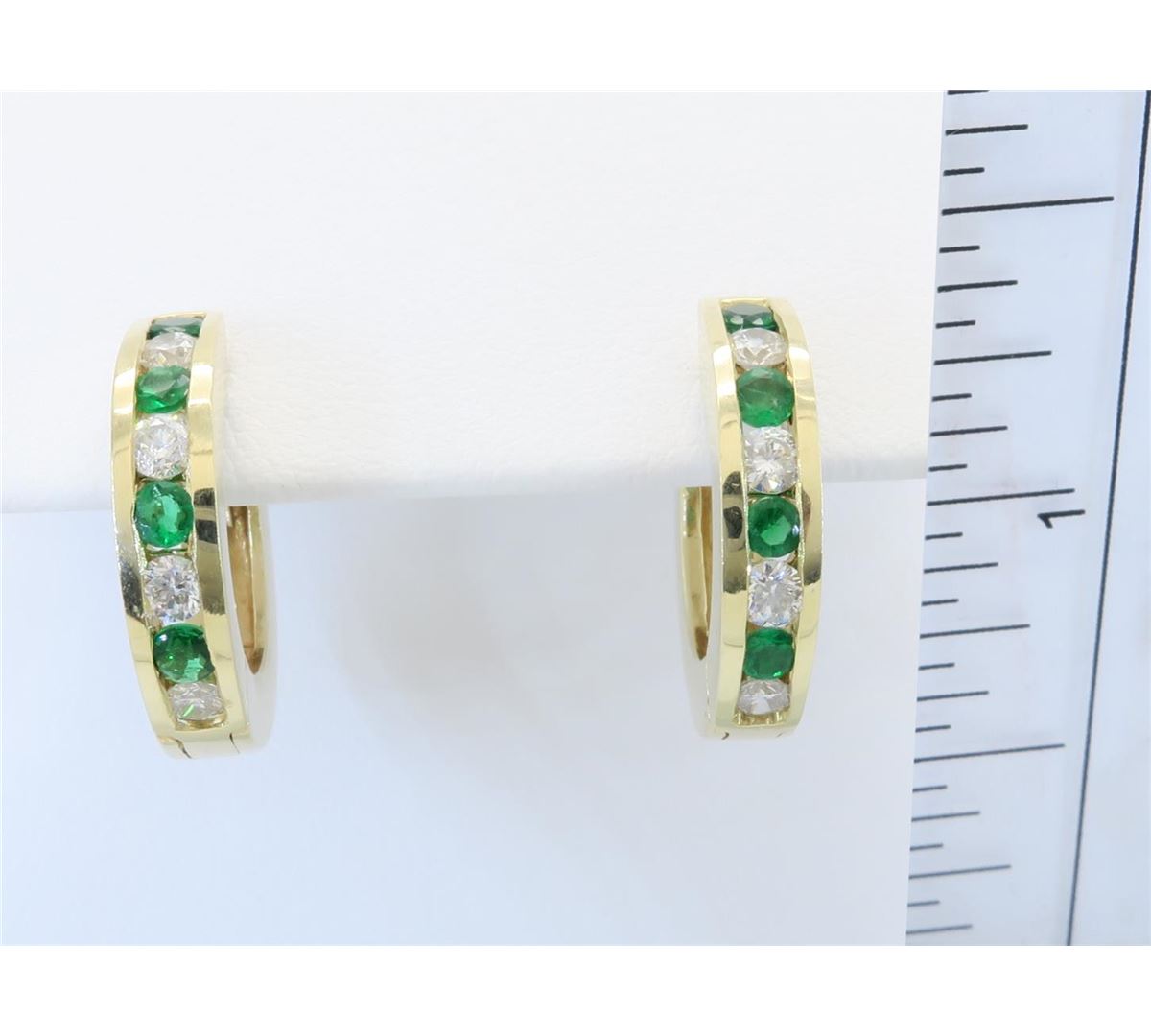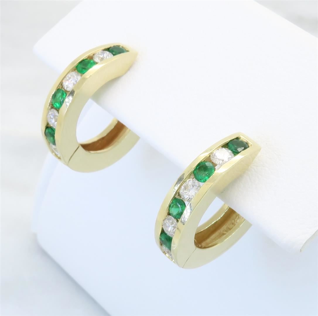 One tested pair of 14K gold diamond and emerald earrings. Containing: Eight Round Brilliant Cut Diamonds. Clarity: I, Color: H-I. 8 round emeralds. Approximate total diamond weight: .40CTW. Approximate total emerald weight: .34CTW. All diamonds are graded in the mounting unless otherwise stated. Weight of earrings: 6.5 grams.