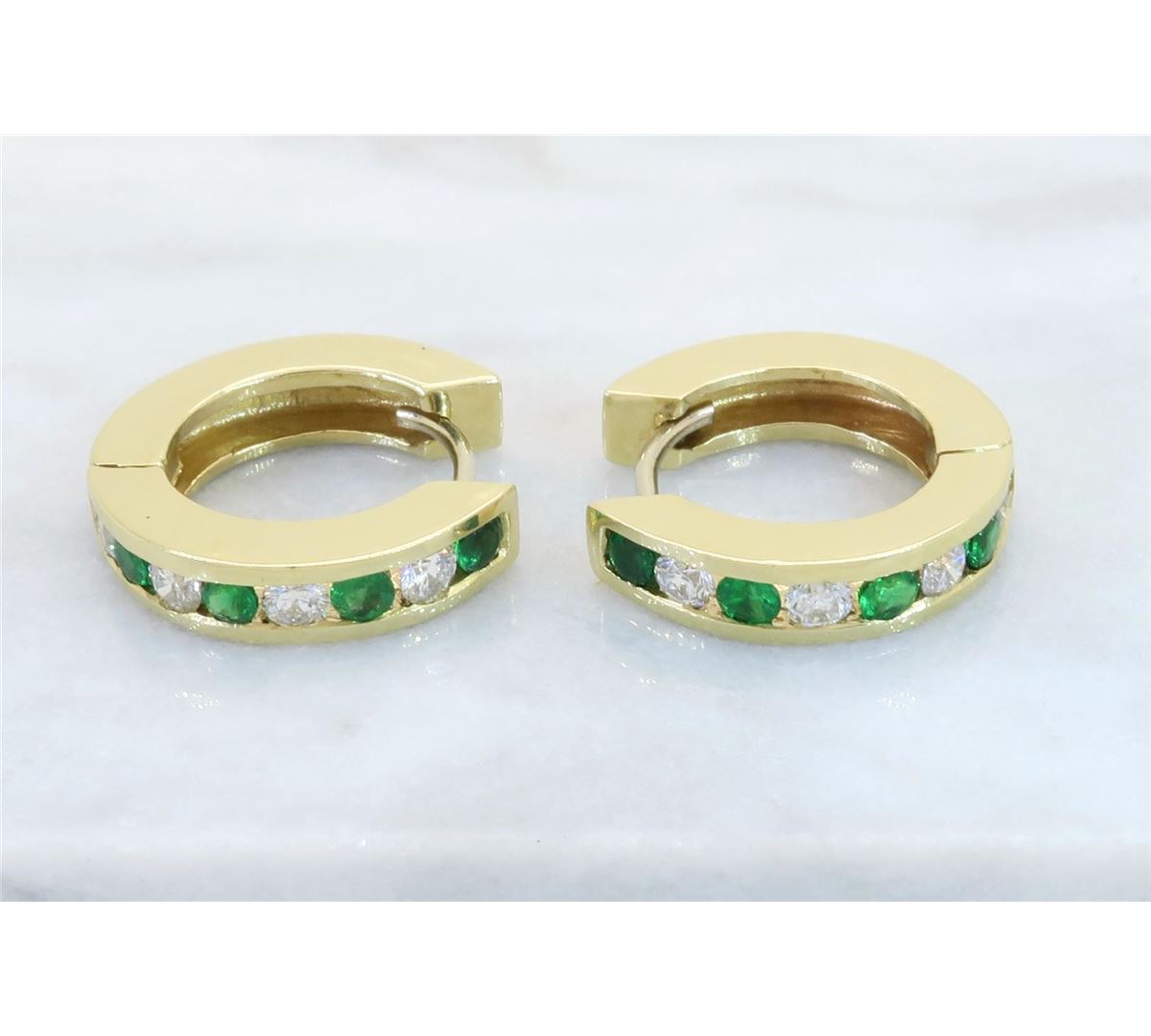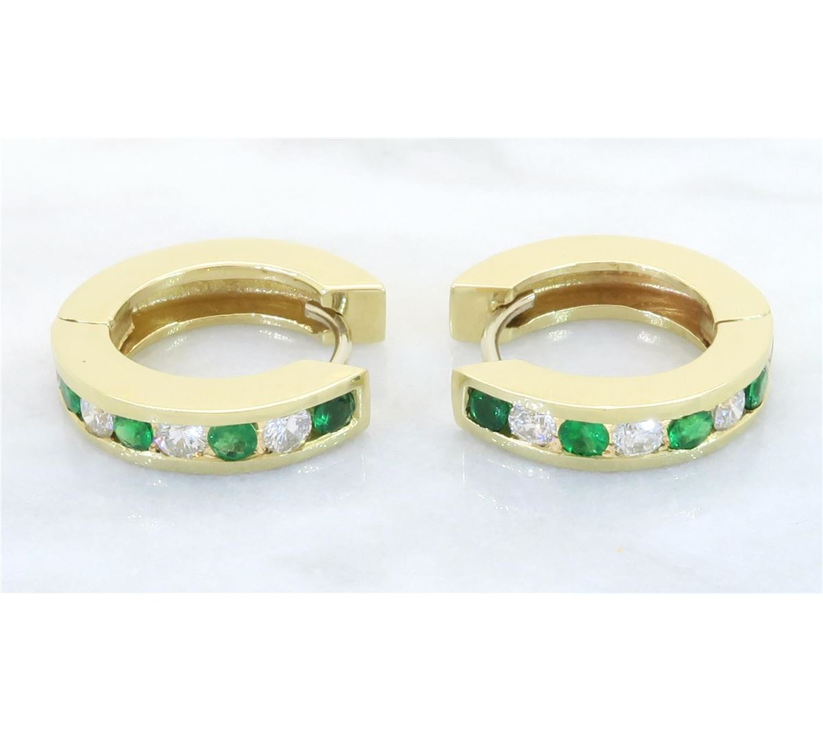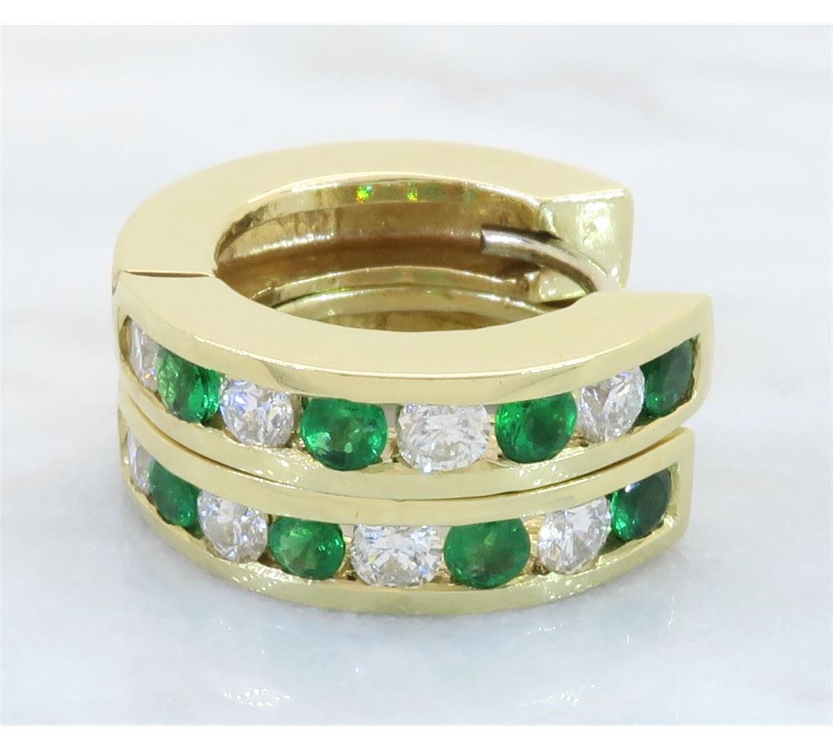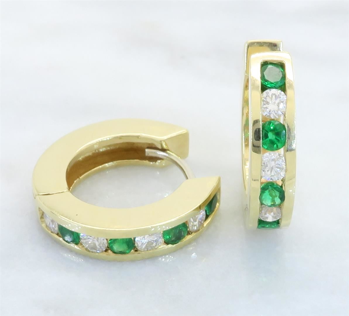 One tested pair of 14K gold diamond and emerald earrings. Containing: Eight Round Brilliant Cut Diamonds. Clarity: I, Color: H-I. 8 round emeralds. Approximate total diamond weight: .40CTW. Approximate total emerald weight: .34CTW. All diamonds are graded in the mounting unless otherwise stated. Weight of earrings: 6.5 grams.