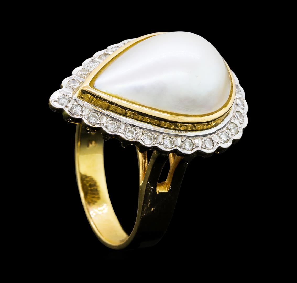 One lady's ring featuring: 14KT yellow gold weighing 8.3 grams containing one pear shaped mabe pearl and diamonds weighing 0.40ctw.