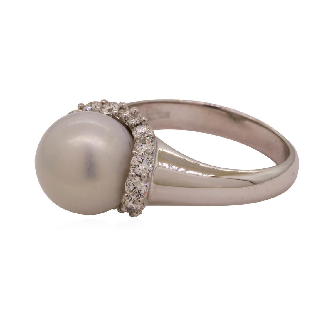 One lady's ring featuring: 18KT white gold weighing 7.6 grams containing one 10mm round pearl and diamonds weighing 0.40ctw.