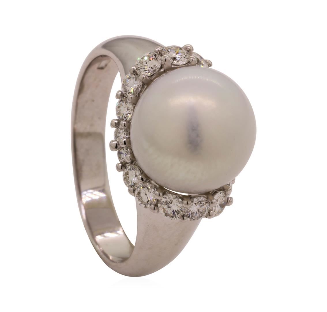 One lady's ring featuring: 18KT white gold weighing 7.6 grams containing one 10mm round pearl and diamonds weighing 0.40ctw.