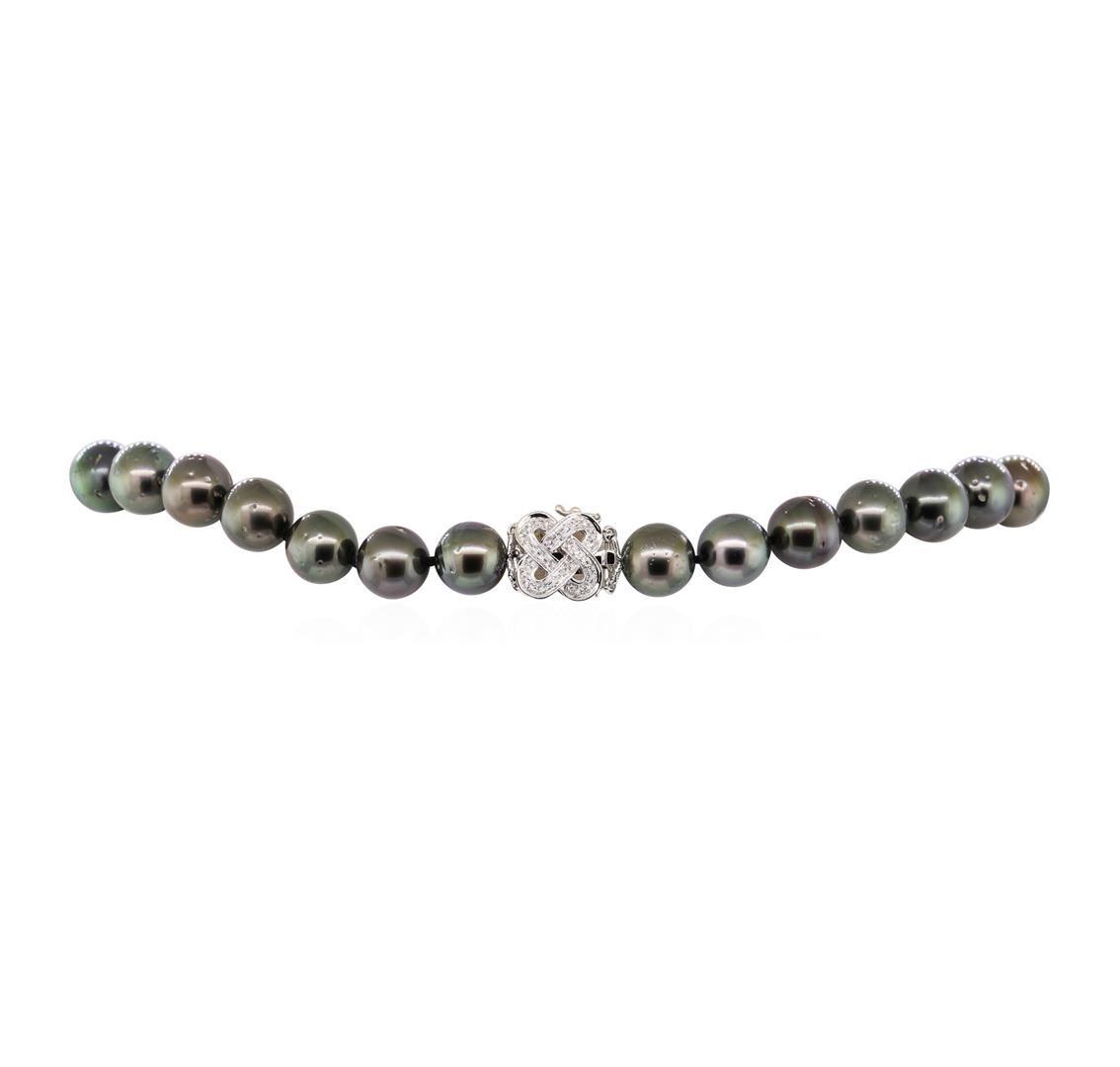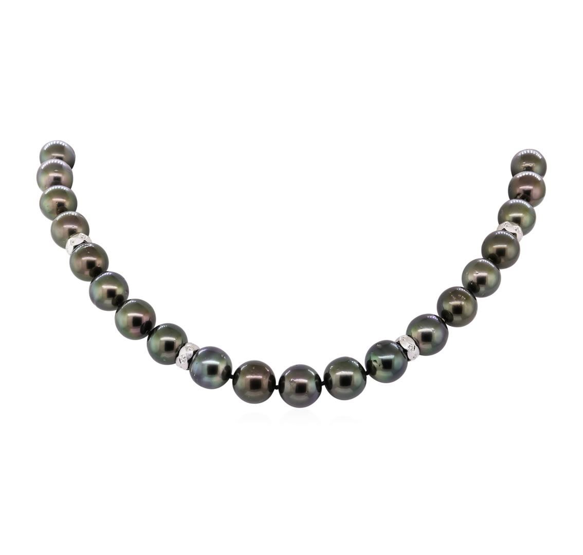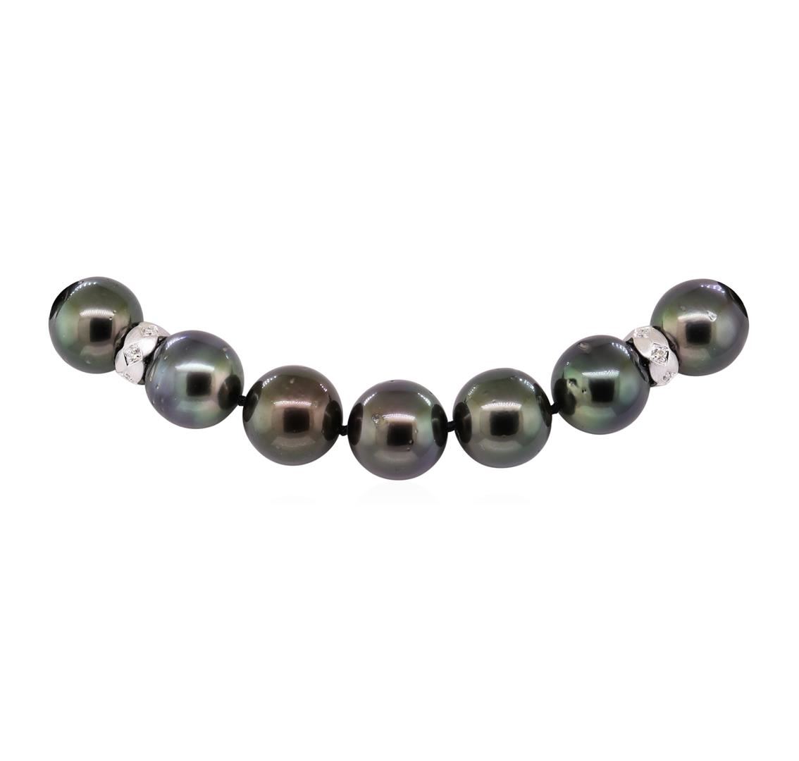 One graduated single strand pearl necklace 18.0' princess length, knotted with a tongue clasp containing 35 Tahitian pearls, 13.3mm to 11.0mm in size. The pearls are black in color, green overtone with a very good luster, round, and mostly clean with excellent matching. The featured pearl necklace contains six white gold rondels and is terminated in a white gold celtic knot motif clasp. Graded on the strand.Tahitian cultured pearls form in the Pinctada Margaritifera oysters. This species is native to the central and South Pacific Ocean but is generally raised in lagoons by pearl farmers. Tahitian cultured pearls take between two to four years to form. Sixty-Eight prong set single cut diamonds, measuring 1.20 - 1.10 x 0.71mm (depth est.) approximate total weight of 68 Stones = 0.40 ct. Graded in the setting. Color G - H Clarity SI-1 to SI-2 Cut Good. Total Weight of Diamonds 0.40 ct.. Total Weight of 93.20gm GAS Appraised at $31790.00. GAS Appraised.