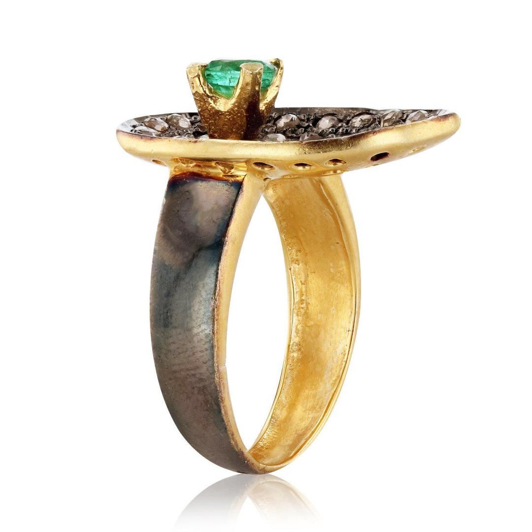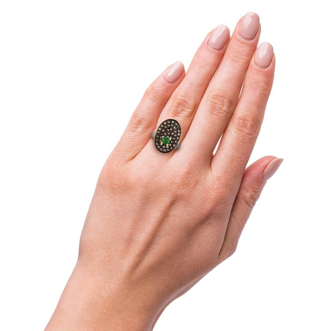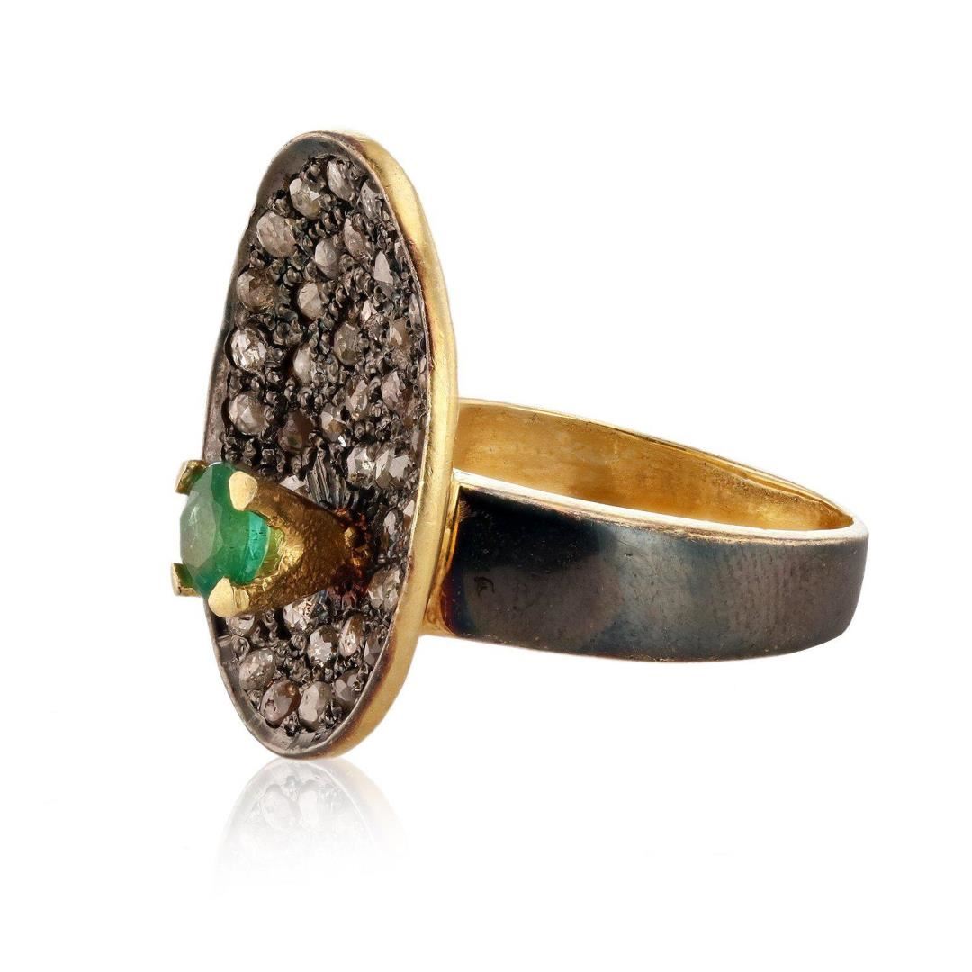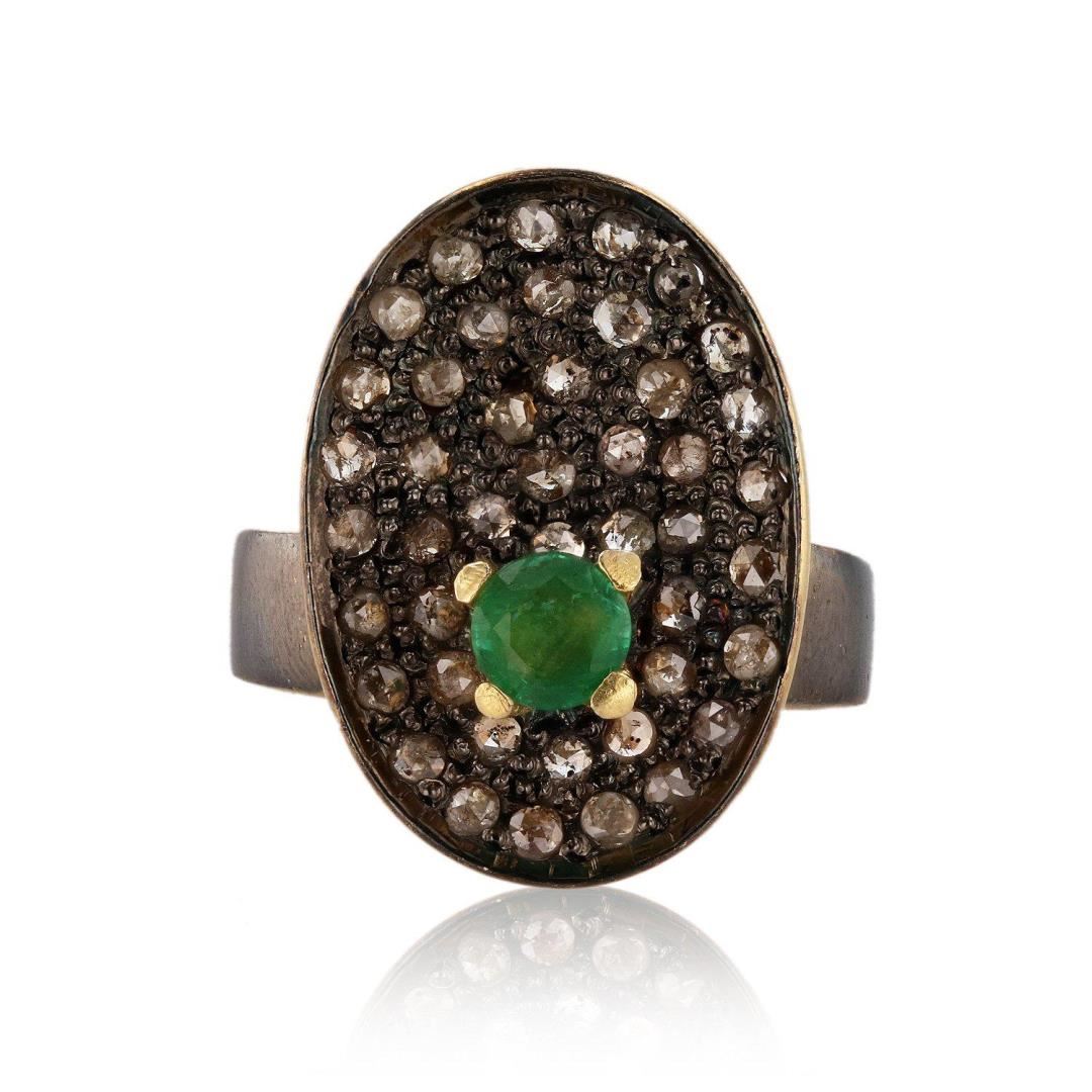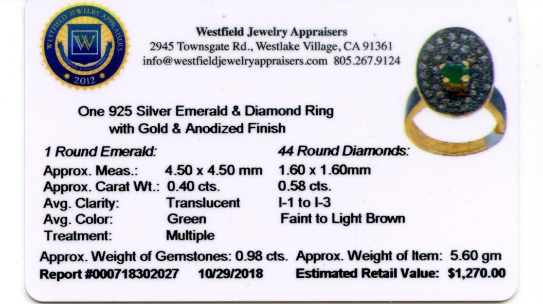 One electronically tested 925 silver ladies cast & assembled emerald & diamond ring. Containing: One prong set round mixed cut natural emerald, measuring 4.50 - 4.50 x 2.93 mm, approximate weight of 0.40ct., clarity is heavily included, type III, medium,