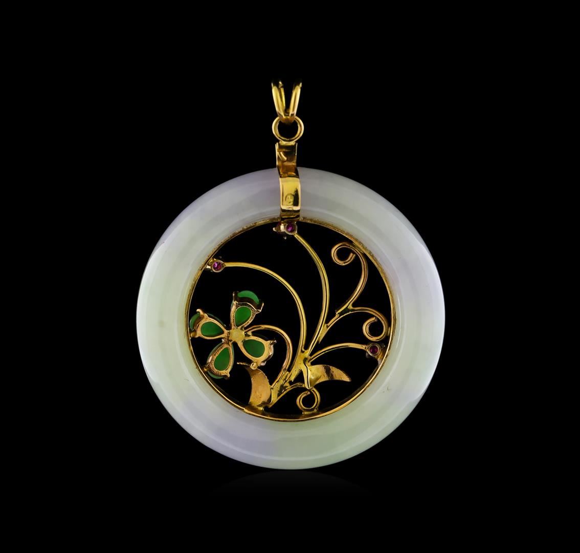 One electronically tested 14KT yellow gold lady's combination cast & assembled fashion circle pendant with a bright polish finish. The featured lady's pendant has a circle/doughnut jade motif measuring 37.5 millimeters in diameter and 7.5 millimeters in width. The doughnut jade is white in color with a hint of green. Identified with markings of "14K". Condition is used, good workmanship. Containing: Four prong set pear cabochon cut natural jadites, measuring 5.00 x 3.20 x 1.30mm, (depth est.) approximate total weight of 0.40ct., medium, moderately strong, yellowish green color, (GIA yG 5/4), cut is very good. Transmitting light diffusely, opaque to translucent. Colored gemstones are presumed to have been subjected to commonly used enhancement processes. Graded in the setting. Three prong set round modified brilliant cut natural rubies, measuring 2.10 - 2.00 x 1.33 mm, (depth est.) approximate total weight of 0.15ct., clarity is slightly included, medium dark, moderately strong, red color, (GIA R 6/4), cut is fair. Transmitting light somewhat diffusely, transparent to translucent. Colored gemstones are presumed to have been subjected to commonly used enhancement processes. Graded in the setting. Total Weight of Colored Stones 0.55ct. Total Weight of Circle Pendant 13.20gm. GAS Appraised at $680.00.