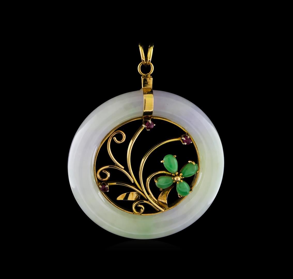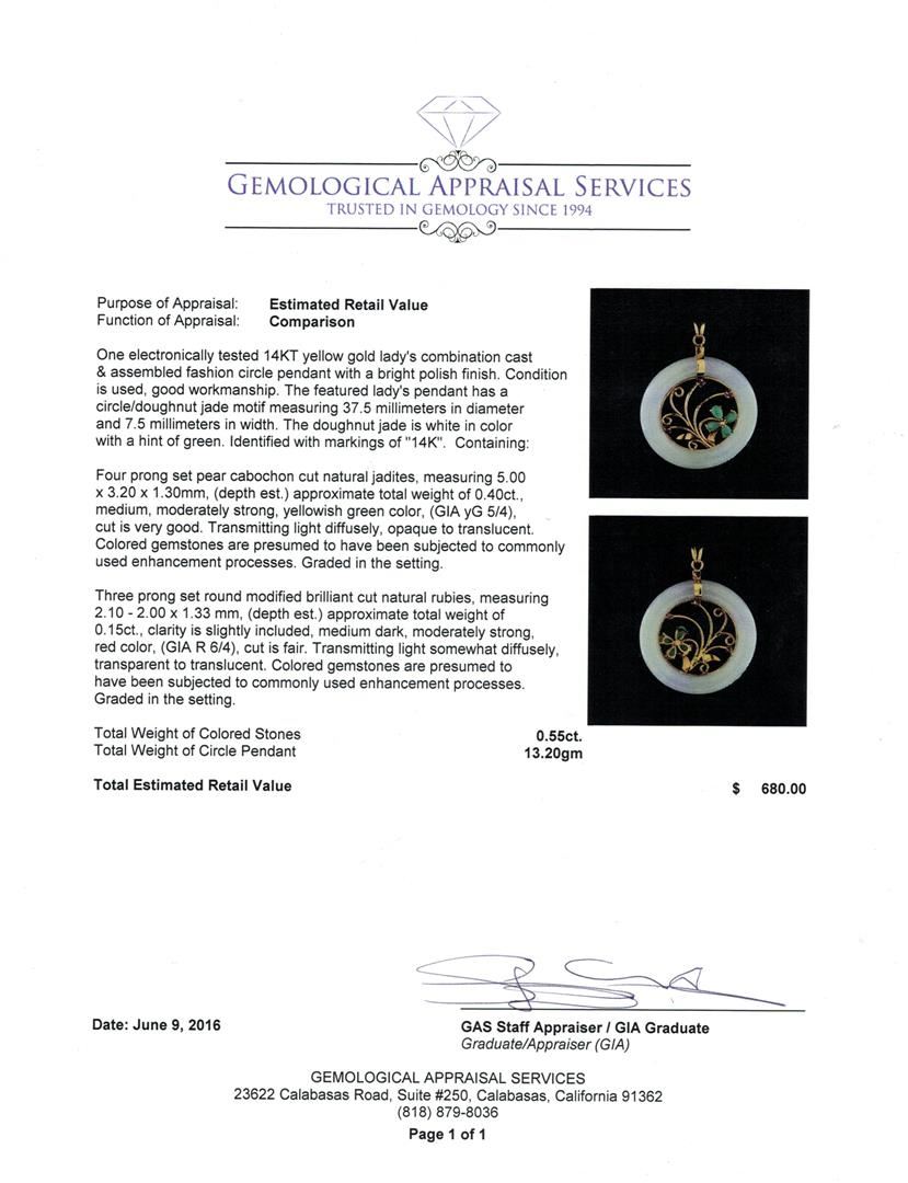 One electronically tested 14KT yellow gold lady's combination cast & assembled fashion circle pendant with a bright polish finish. The featured lady's pendant has a circle/doughnut jade motif measuring 37.5 millimeters in diameter and 7.5 millimeters in width. The doughnut jade is white in color with a hint of green. Identified with markings of "14K". Condition is used, good workmanship. Containing: Four prong set pear cabochon cut natural jadites, measuring 5.00 x 3.20 x 1.30mm, (depth est.) approximate total weight of 0.40ct., medium, moderately strong, yellowish green color, (GIA yG 5/4), cut is very good. Transmitting light diffusely, opaque to translucent. Colored gemstones are presumed to have been subjected to commonly used enhancement processes. Graded in the setting. Three prong set round modified brilliant cut natural rubies, measuring 2.10 - 2.00 x 1.33 mm, (depth est.) approximate total weight of 0.15ct., clarity is slightly included, medium dark, moderately strong, red color, (GIA R 6/4), cut is fair. Transmitting light somewhat diffusely, transparent to translucent. Colored gemstones are presumed to have been subjected to commonly used enhancement processes. Graded in the setting. Total Weight of Colored Stones 0.55ct. Total Weight of Circle Pendant 13.20gm. GAS Appraised at $680.00.