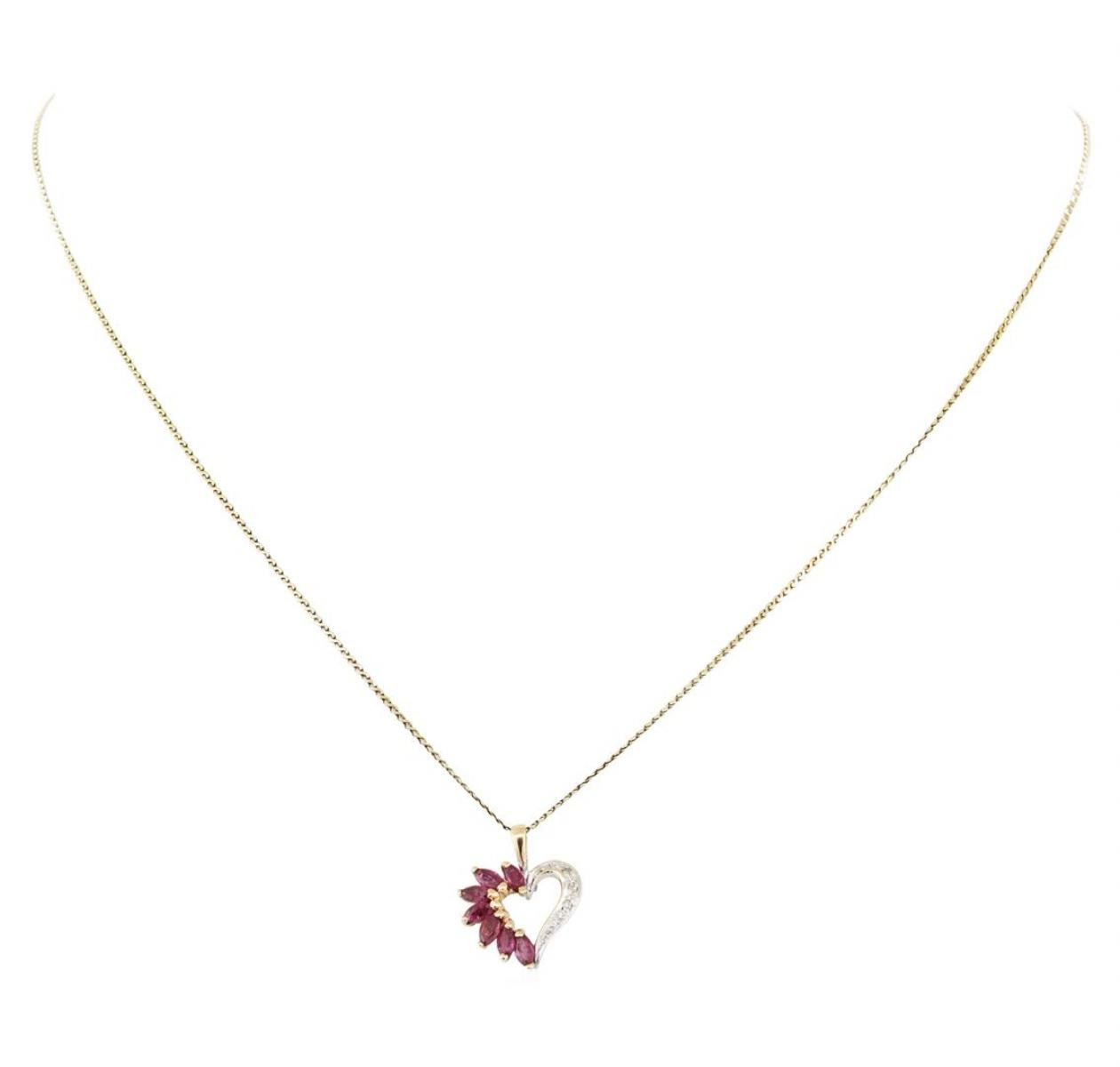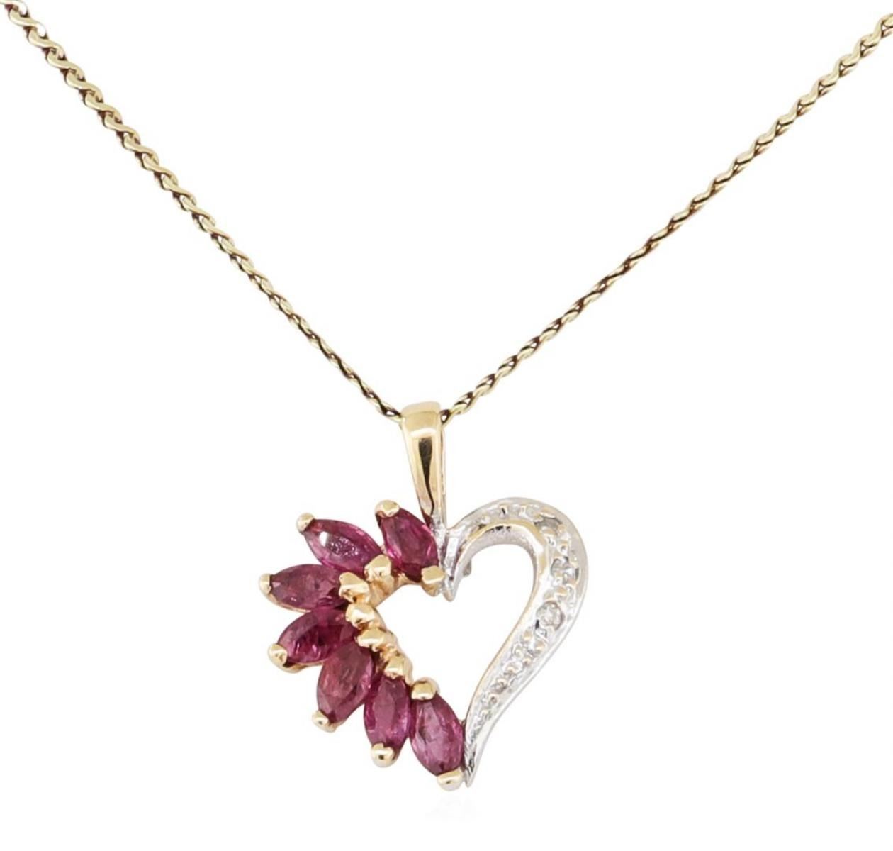 One heart shaped pendant with an attached 16 inch long, 1mm "s" link chain featuring: 14KT yellow gold weighing 2.1 grams containing rubies weighing 0.35ctw and diamonds weighing 0.05ctw.