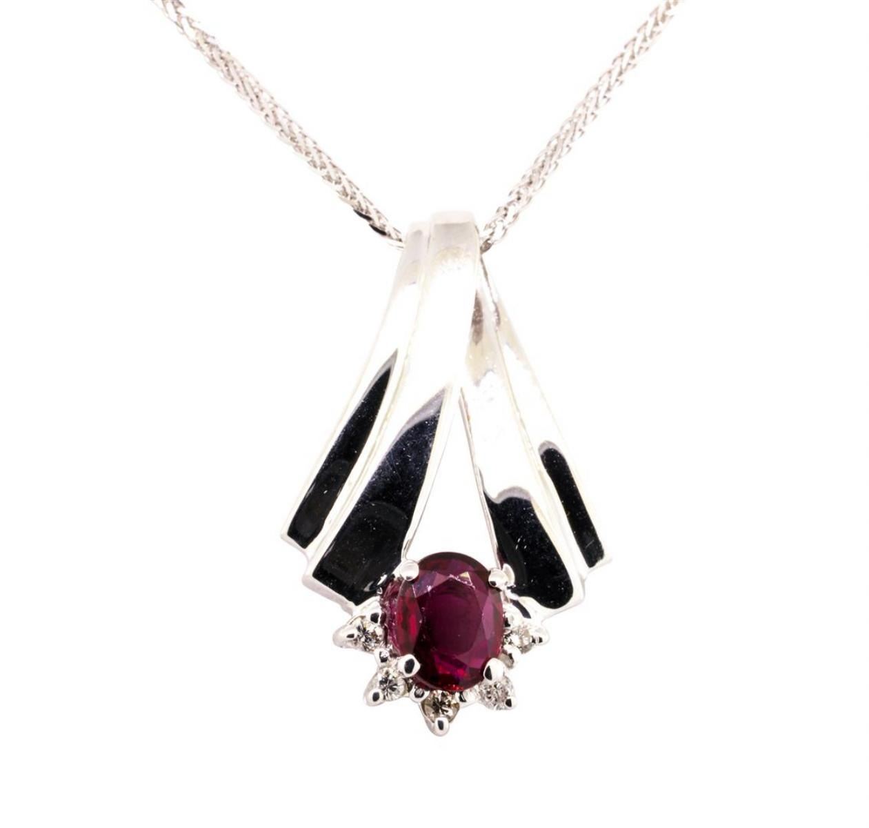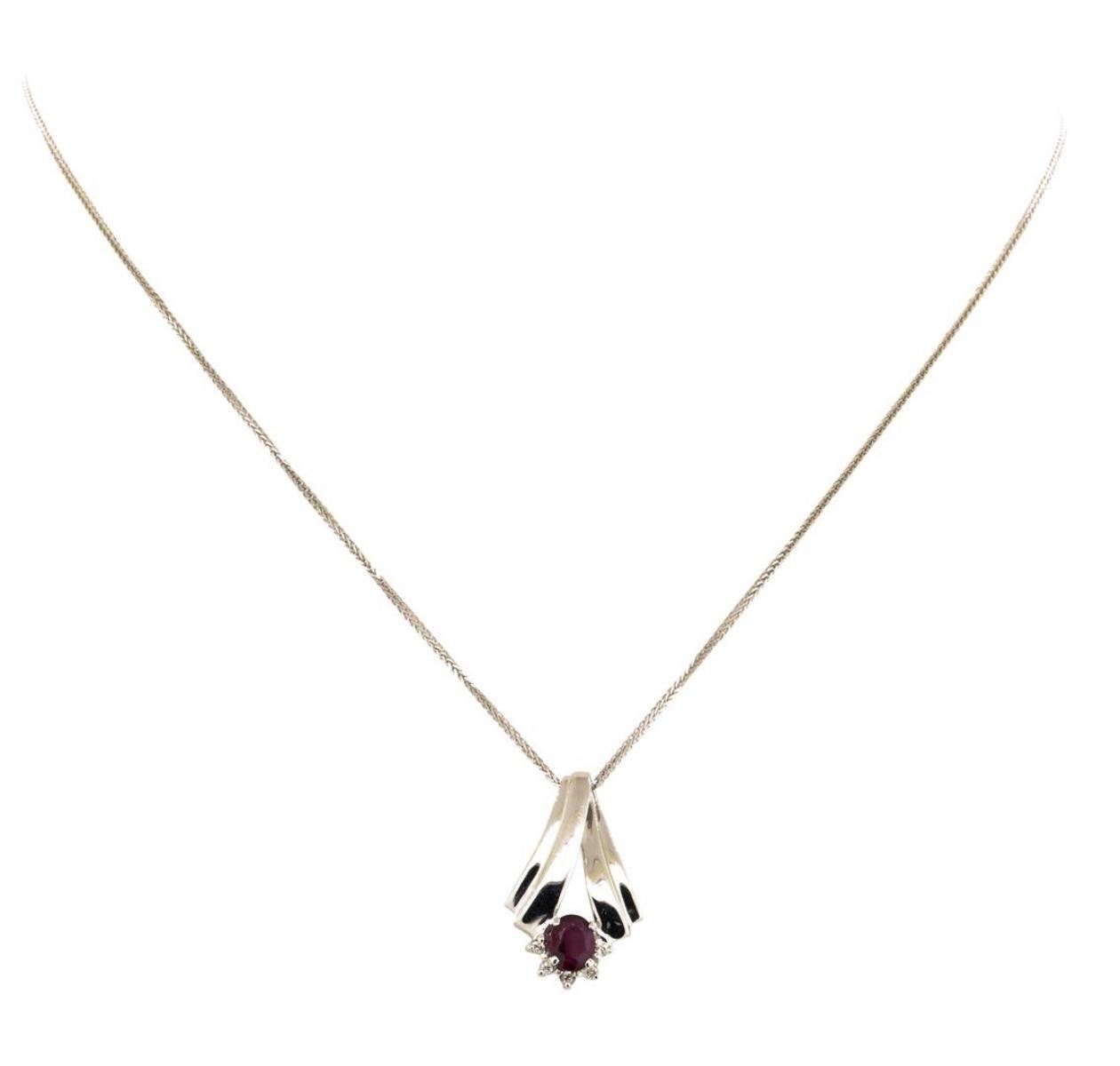 One pendant with a sixteen inch long 1mm wide flat wheat link chain featuring: 14KT white gold weighing 4.3 grams containing one ruby weighing 0.40ct and diamonds weighing 0.05ctw.