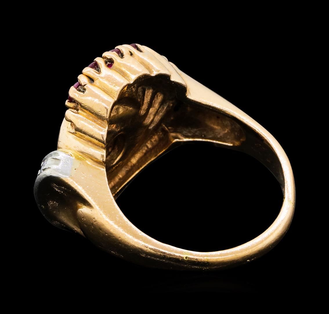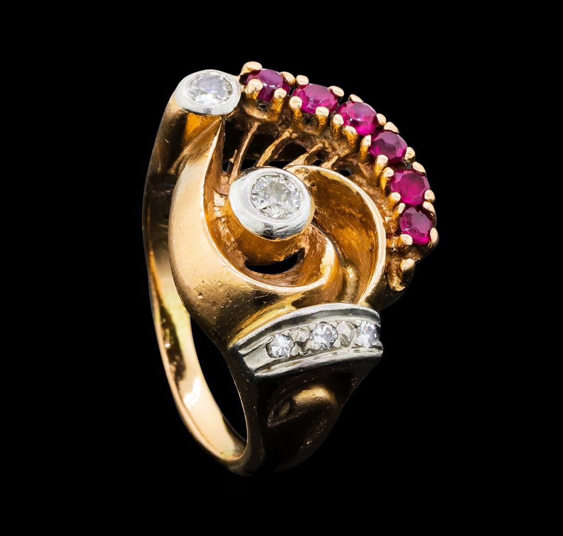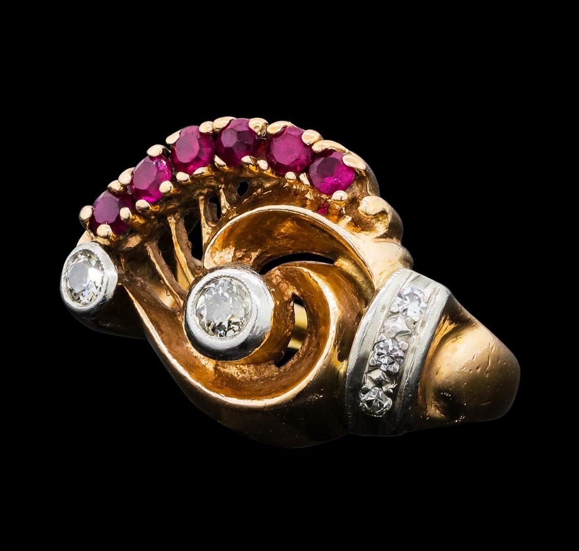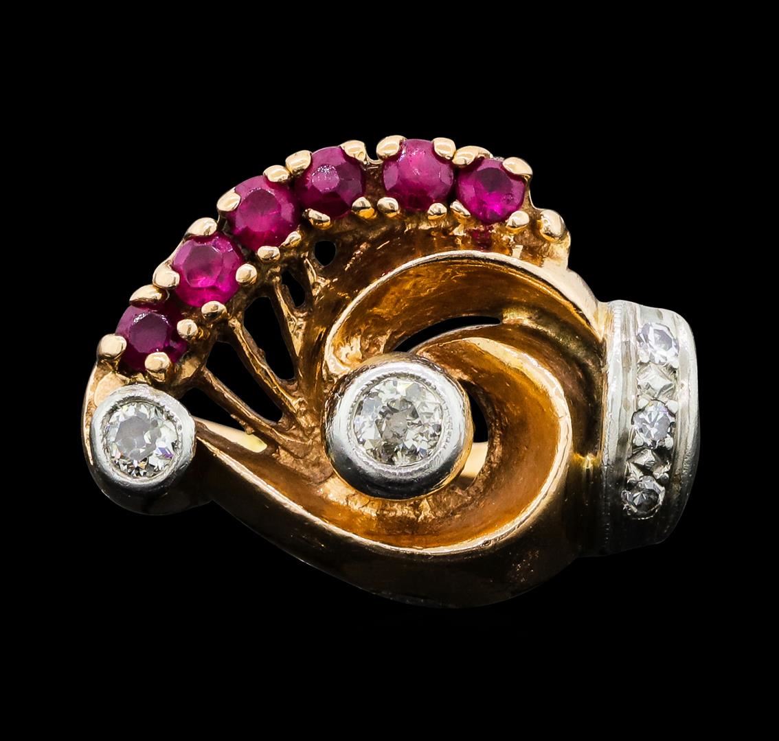One lady's ring featuring: 14KT rose and white gold weighing 9.6 grams containing rubies weighing 0.40ctw and diamonds weighing 0.25ctw.