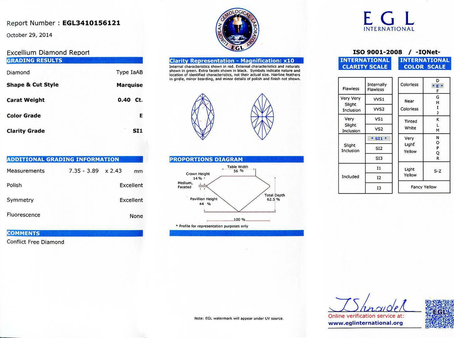 One electronically tested platinum ladies cast diamond unity ring. Condition is new, good workmanship. The featured diamond is set within a diamond bezel supported by diamond set shoulders, completed by a one and one-half millimeter wide band. Bright polish finish with milgrain detailing. Trademark is Orianne. Identified with markings of "PT950" One prong set marquise shaped cut diamond, measuring 7.35 x 3.89 x 2.43mm exact weight 0.40ct. EGL International Report attached. Graded loose prior to setting in the EGL Laboratory Report #EGL3410156121 Clarity SI-1 Color Depth 62.5% Table 56.0% Polish Excellent Symmetry Excellent Thirty prong set round brilliant cut diamonds approximate total weight of 30 Stones = 0.26ct. Graded in the setting Clarity VS-1 to SI-1 Color E - G Total Weight of Diamonds 0.66ct Total Weight of Ring 4.24 gm