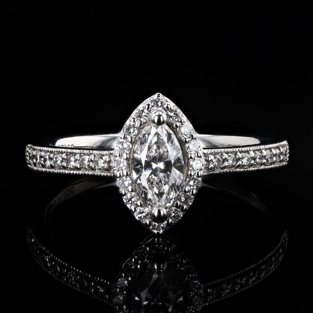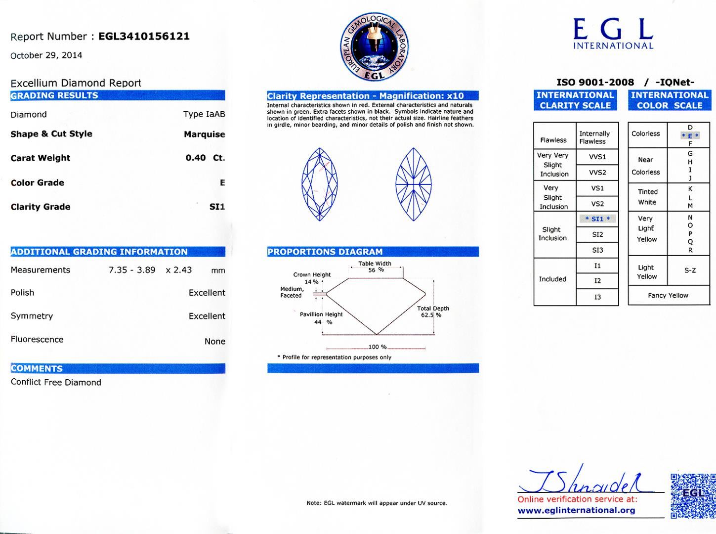 One electronically tested platinum ladies cast diamond unity ring. Condition is new, good workmanship. The featured diamond is set within a diamond bezel supported by diamond set shoulders, completed by a one and one-half millimeter wide band. Bright polish finish with milgrain detailing. Trademark is Orianne. Identified with markings of "PT950" One prong set marquise shaped cut diamond, measuring 7.35 x 3.89 x 2.43mm exact weight 0.40ct. EGL International Report attached. Graded loose prior to setting in the EGL Laboratory Report #EGL3410156121 Clarity SI-1 Color Depth 62.5% Table 56.0% Polish Excellent Symmetry Excellent Thirty prong set round brilliant cut diamonds approximate total weight of 30 Stones = 0.26ct. Graded in the setting Clarity VS-1 to SI-1 Color E - G Total Weight of Diamonds 0.66ct Total Weight of Ring 4.24 gm