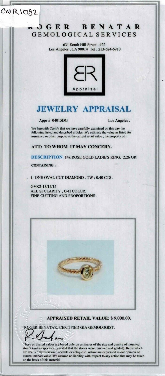 14K ROSE GOLD NATURAL DIAMOND RING:2.26 GRAMS/DIAMOND:0.40CT//#GVR1092 **Warmly crafted in 14k rose gold, this 0.40ct Oval Cut Bezel Setting Diamond Solitaire sparkles dynamically. A stone of mental and psychic activation, Diamonds promote truth, vision and alignment with the higher mind, for those who use them consciously. This engagement ring has a scrolling detailed shank adding classic, textural appeal.**