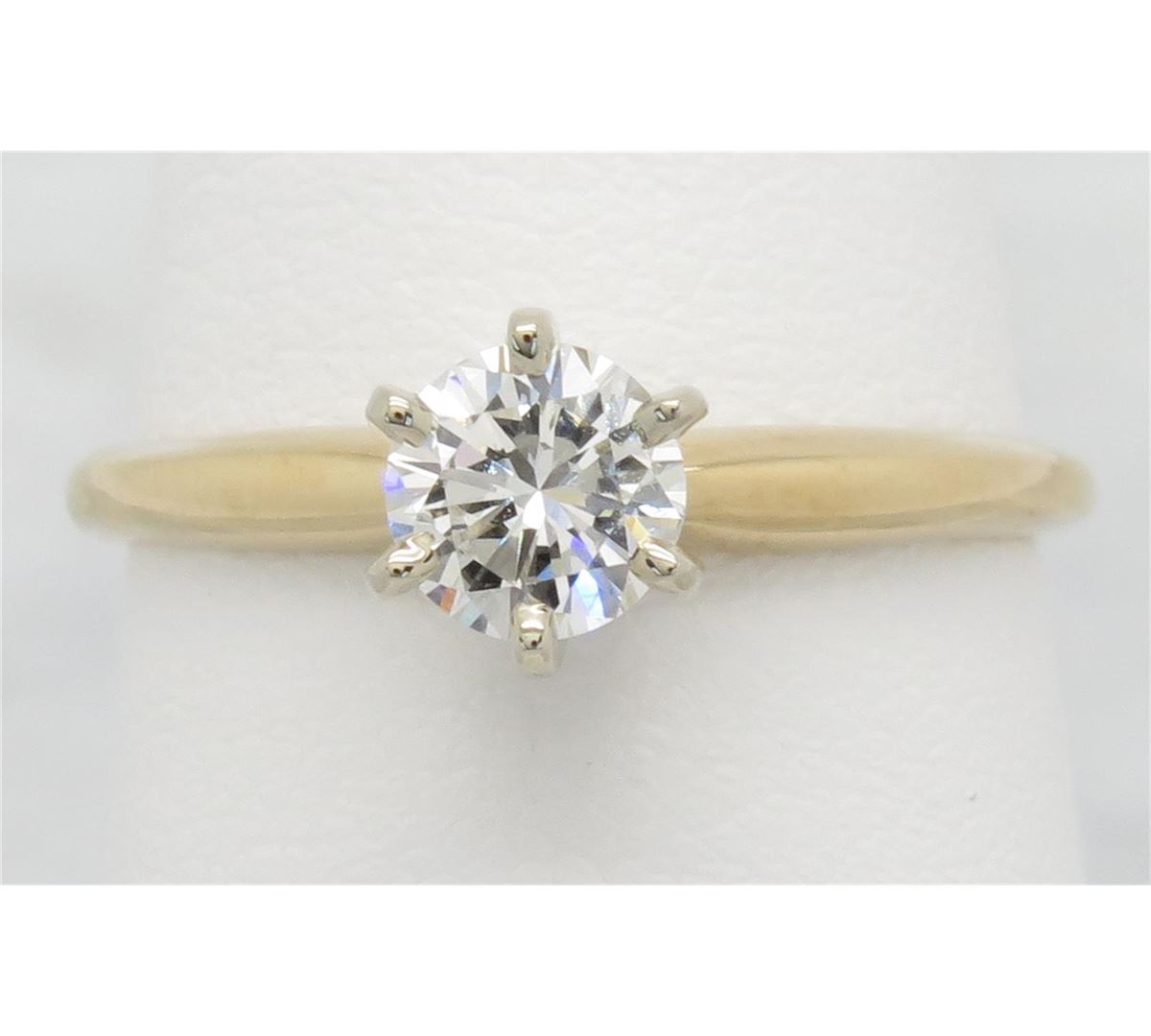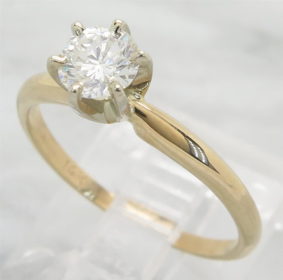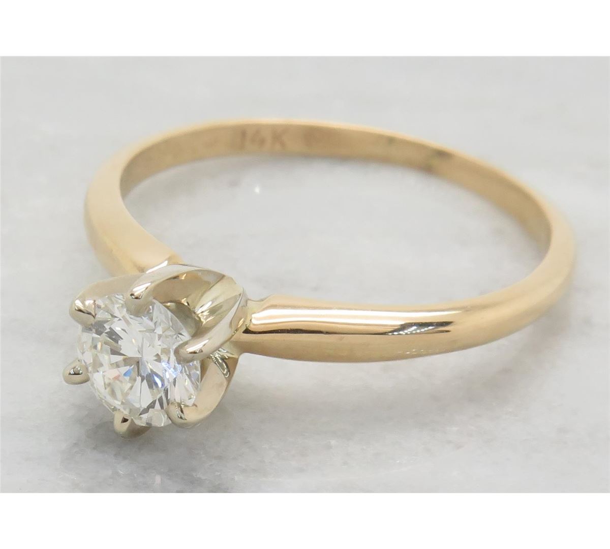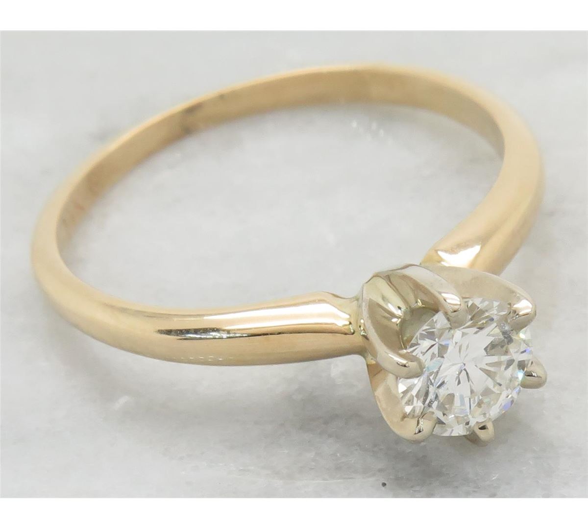 One tested 14K yellow gold diamond ring. Containing: One Round Brilliant Cut Diamond. Approximate Size: .40CT, Clarity: VS1, Color: I-J. Diamonds are graded in the mounting, unless otherwise stated. Weight: 1.8 grams, Size: 5.5.