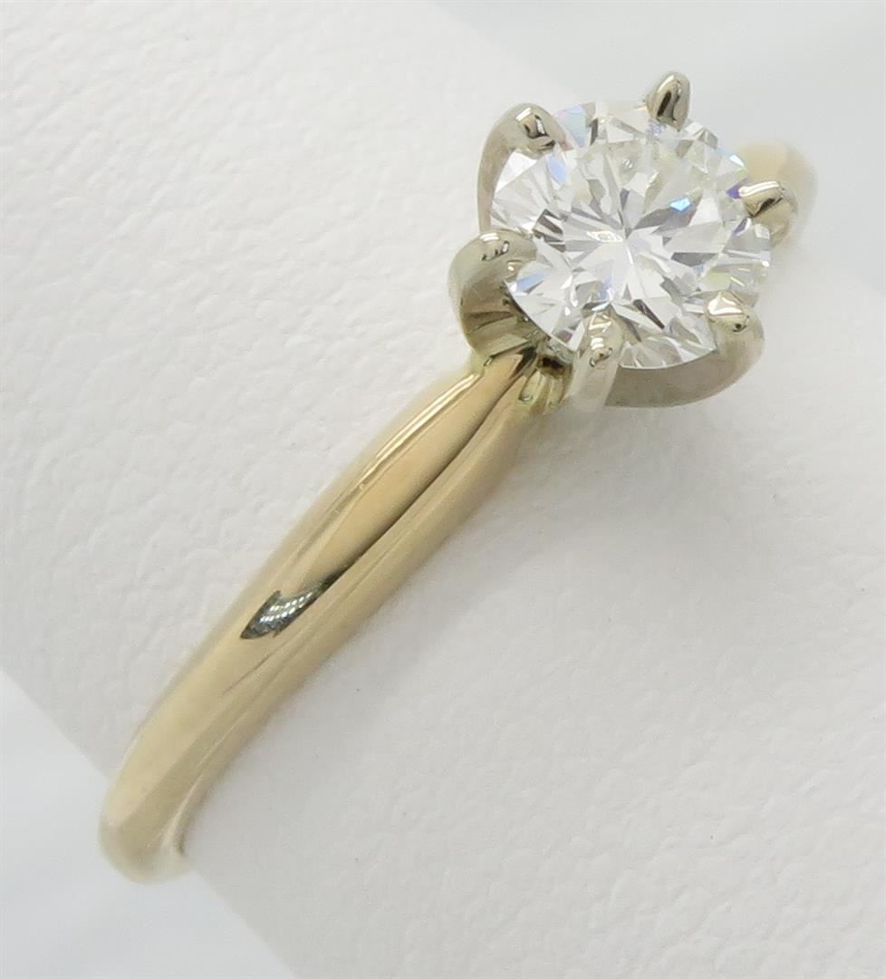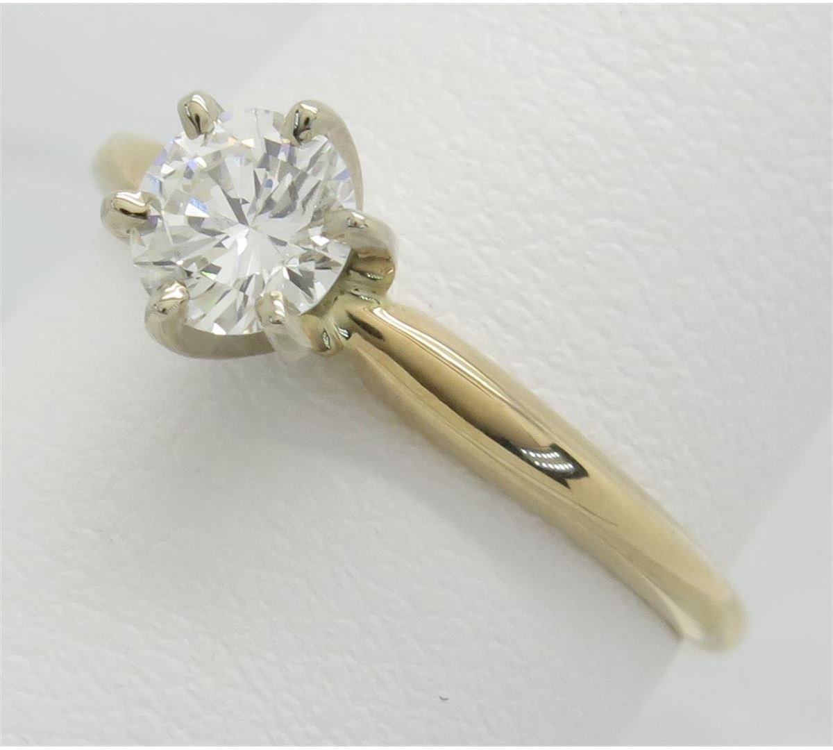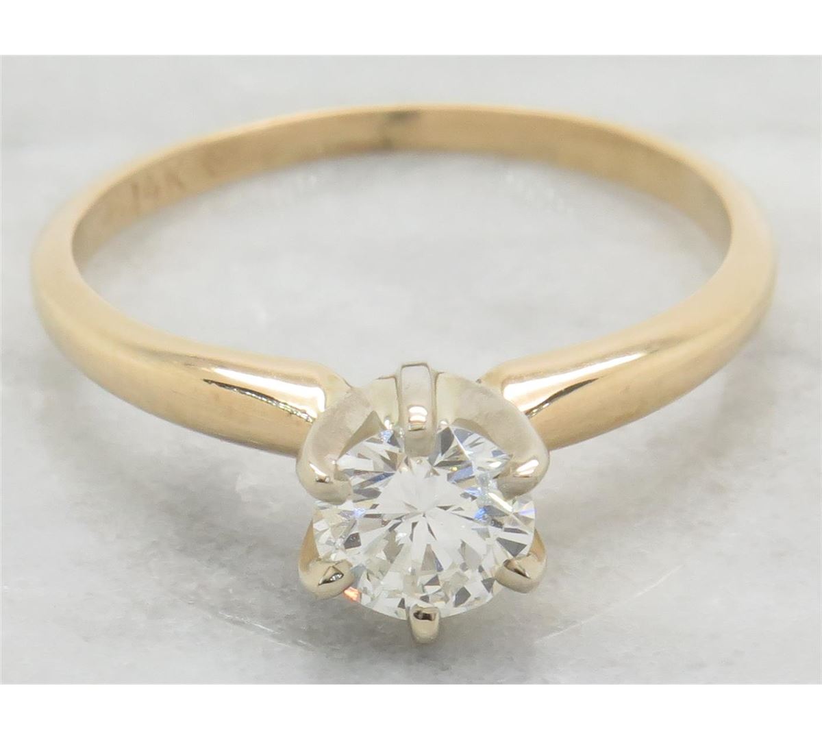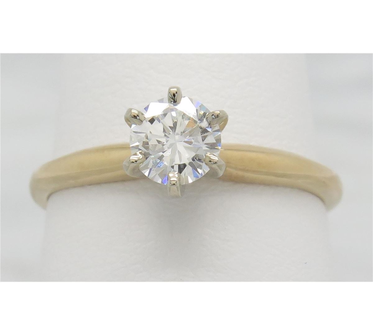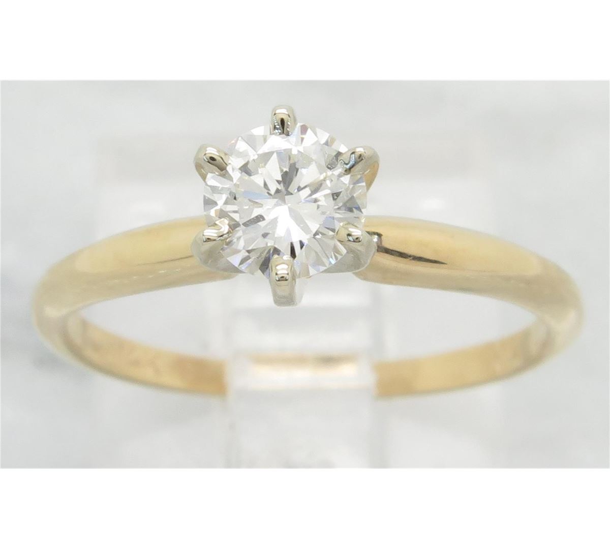 One tested 14K yellow gold diamond ring. Containing: One Round Brilliant Cut Diamond. Approximate Size: .40CT, Clarity: VS1, Color: I-J. Diamonds are graded in the mounting, unless otherwise stated. Weight: 1.8 grams, Size: 5.5.