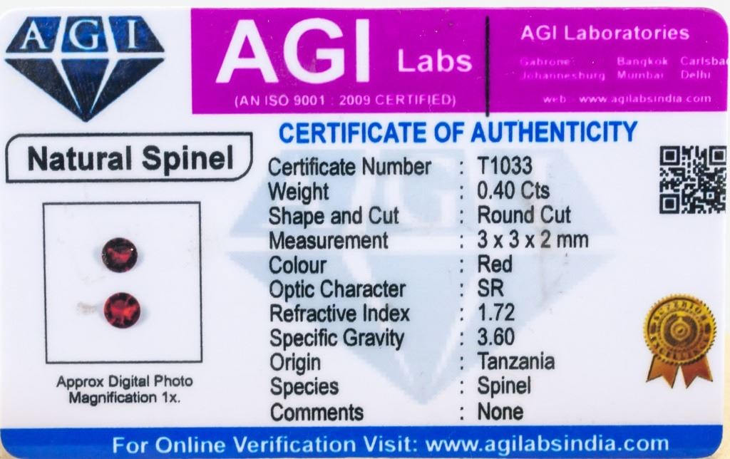 Two (2) 0.40 ct (total) round cut red natural spinel. Origin: Tanzania. Accompanied with AGI certificate.
