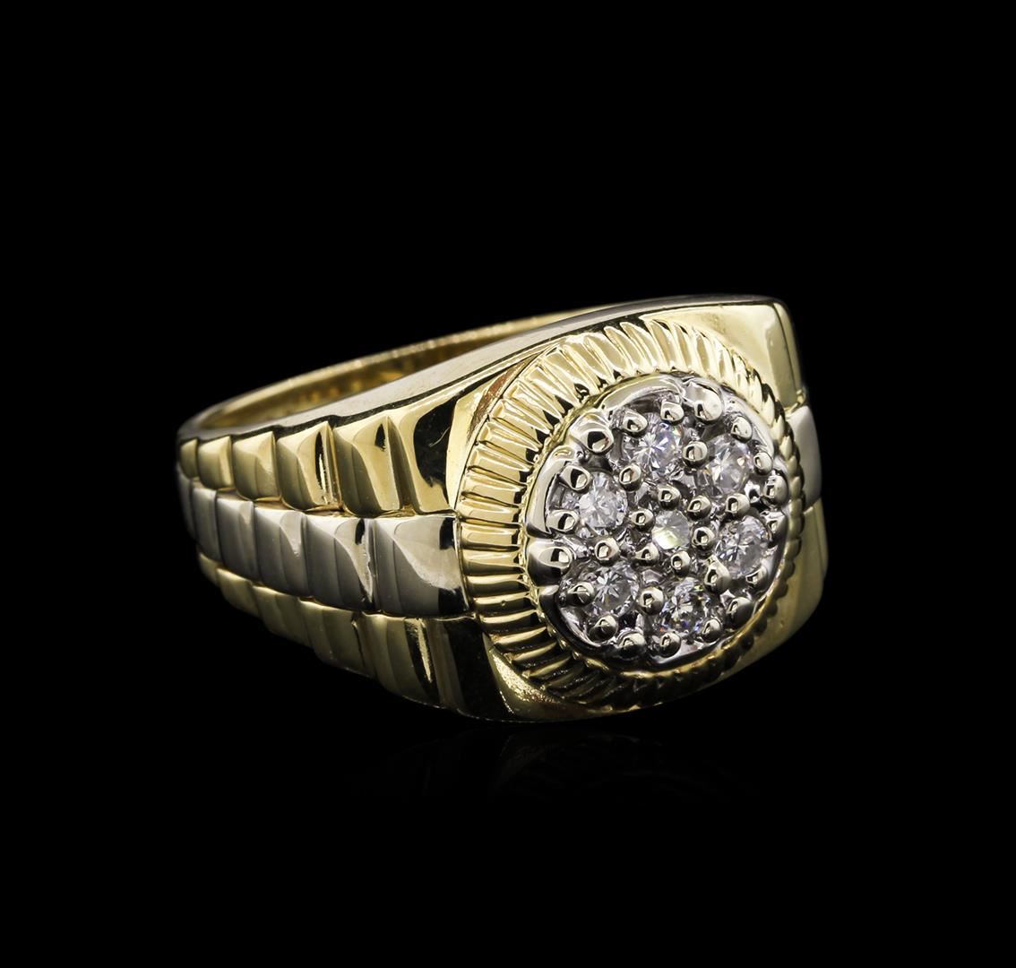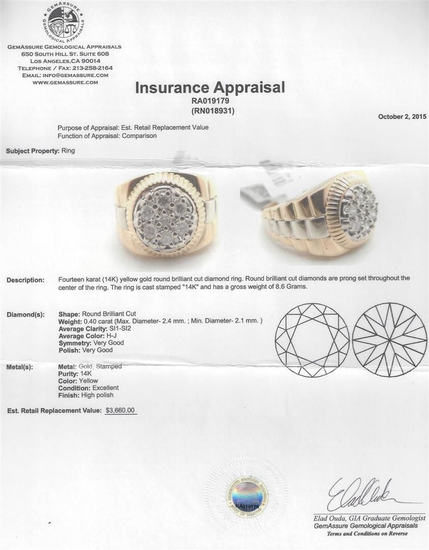 Fourteen karat (14K) yellow gold round brilliant cut diamond ring. Round brilliant cut diamonds are prong set throughout the center of the ring. The ring is cast stamped "14K" and has a gross weight of 8.6 Grams. Diamond(s): Shape: Round Brilliant Cut. Weight: 0.40 carat (Max. Diameter- 2.4 mm. ; Min. Diameter 2.1 mm. ) Average Clarity: SI1-SI2. Average Color: H-J. Symmetry: Very Good. Polish: Very Good. Metal(s): Metal: Gold, Stamped. Purity: 14K. Color: Yellow. Condition: Excellent. Finish: High polish. GGA Appraised.