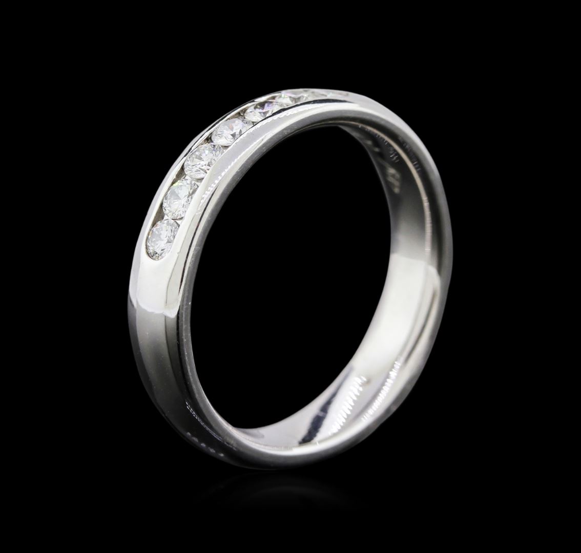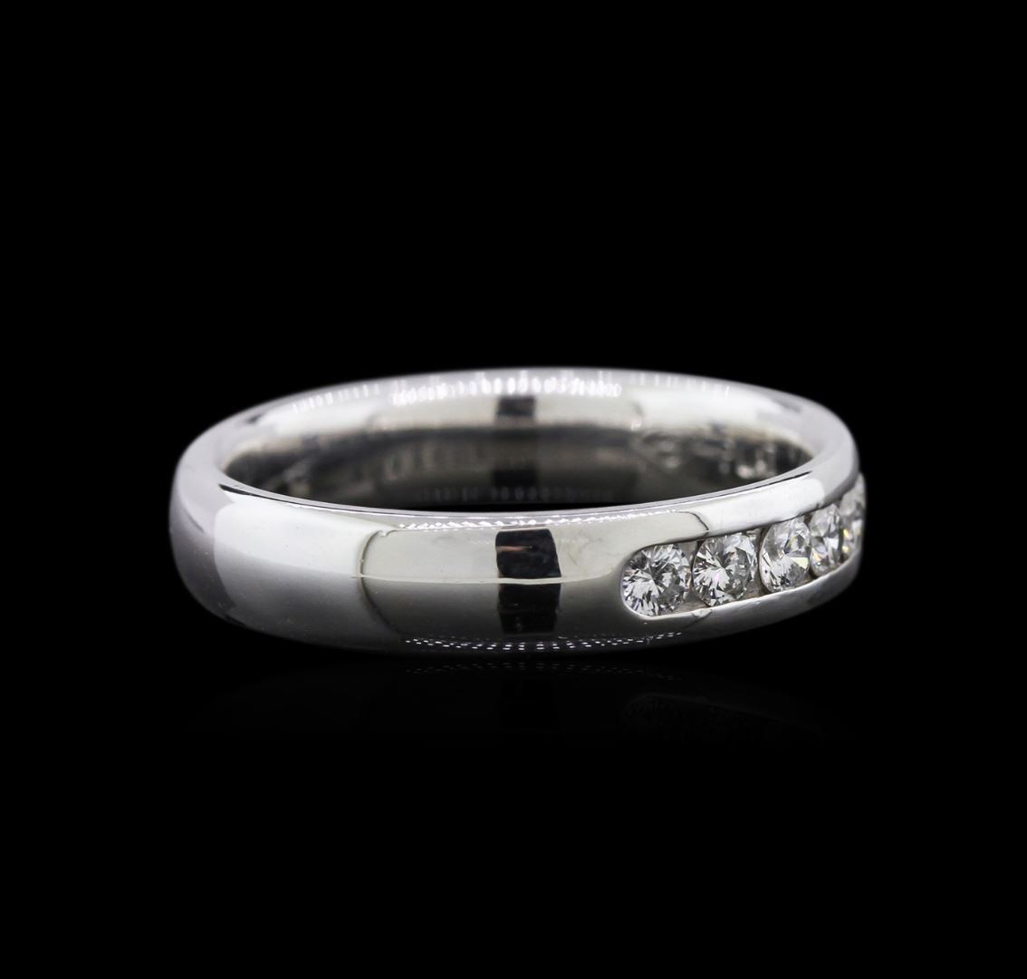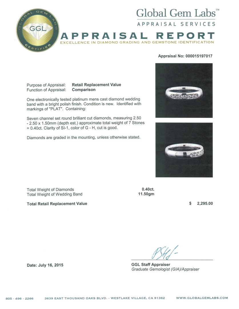 One electronically tested platinum mens cast diamond wedding band with a bright polish finish. Identified with markings of "PLAT". Condition is new. Containing: Seven channel set round brilliant cut diamonds, measuring 2.50 - 2.50 x 1.50mm (depth est.) approximate total weight of 7 Stones = 0.40ct. Clarity: SI-1. Color: G - H, Cut is Good. Diamonds are graded in the mounting, unless otherwise stated. Total Weight of Diamonds 0.40ct. Total Weight of Wedding Band 11.50 grams. GGL Appraised at $2,295.00.
