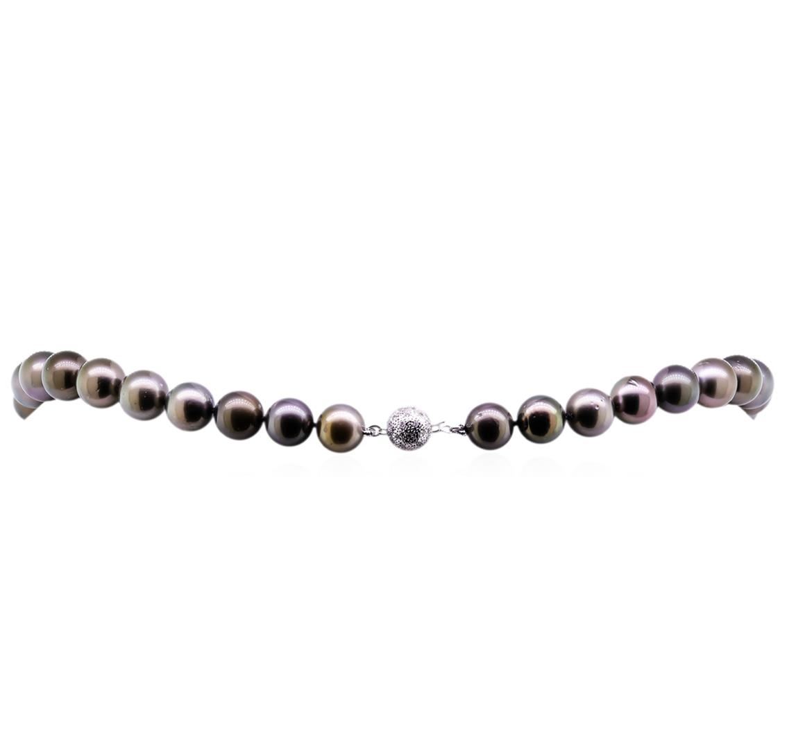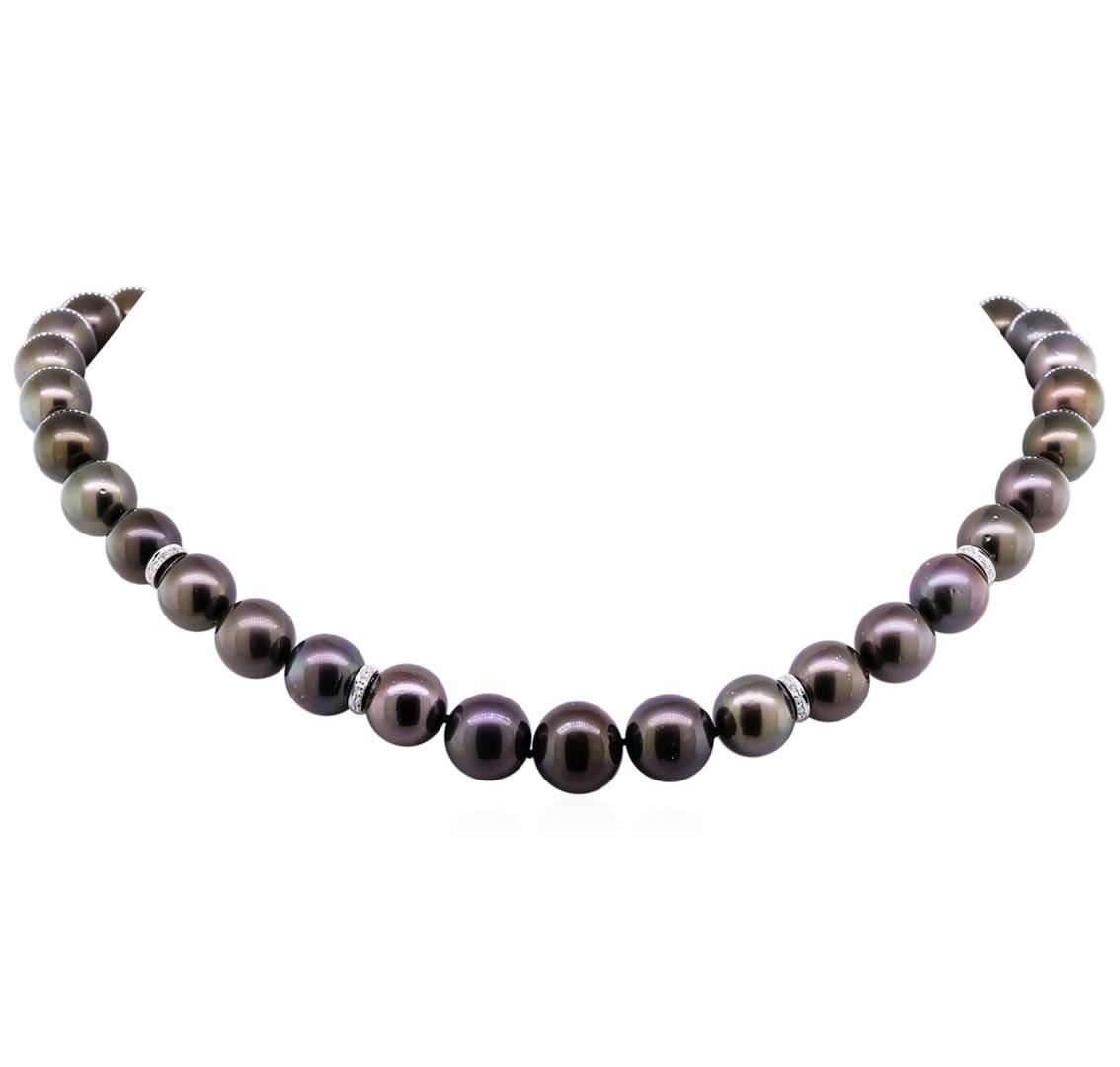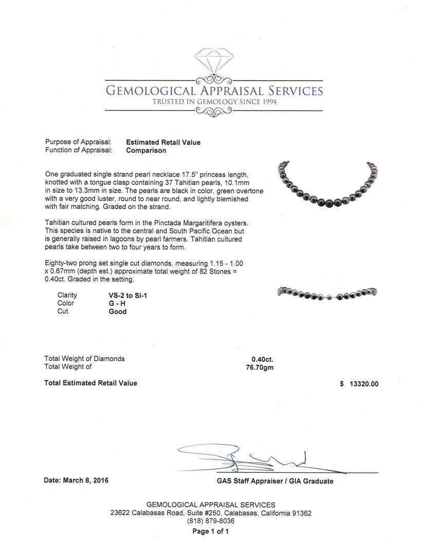 One graduated single strand pearl necklace 17.5" princess length, knotted with a tongue clasp containing 37 Tahitian pearls, 10.1mm in size to 13.3mm in size. The pearls are black in color, green overtone with a very good luster, round to near round, and lightly blemished with fair matching. Graded on the strand. Tahitian cultured pearls form in the Pinctada Margaritifera oysters. This species is native to the central and South Pacific Ocean but is generally raised in lagoons by pearl farmers. Tahitian cultured pearls take between two to four years to form. Eighty-Two prong set single cut diamonds, measuring 1.15 - 1.00 x 0.67mm (depth est.) approximate total weight of 82 Stones = 0.40ct. Graded in the setting. Clarity: VS-2 to SI-1. Color: G - Good. Total Weight of Diamonds 0.40ct. Total Weight of 76.70gm. GAS Appraised at $13,320.00.