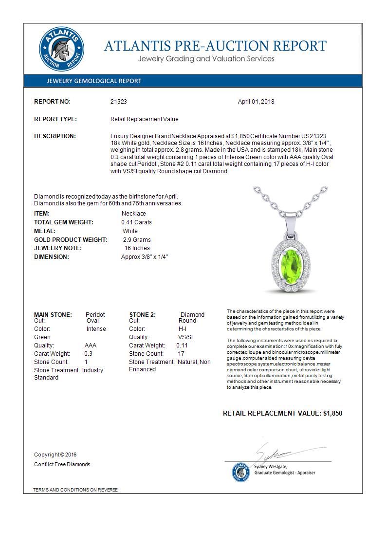 REF-26F2N -21323 ---- 0.41 CTW Peridot & Micro Pave VS/SI Diamond Necklace Halo 18K White Gold ---- Luxury Designer Brand Necklace Appraised at $1,850 Certificate Number US21323 18k White gold, Necklace Size is 16 Inches, Necklace measuring approx. 3/8" x 1/4" , weighing in total approx. 2.8 grams. Made in the USA and is stamped 18k, Main stone 0.3 carat total weight containing 1 pieces of Intense Green color with AAA quality Oval shape cut Peridot , Stone #2 0.11 carat total weight containing 17 pieces of H-I color with VS/SI quality Round shape cut Diamond