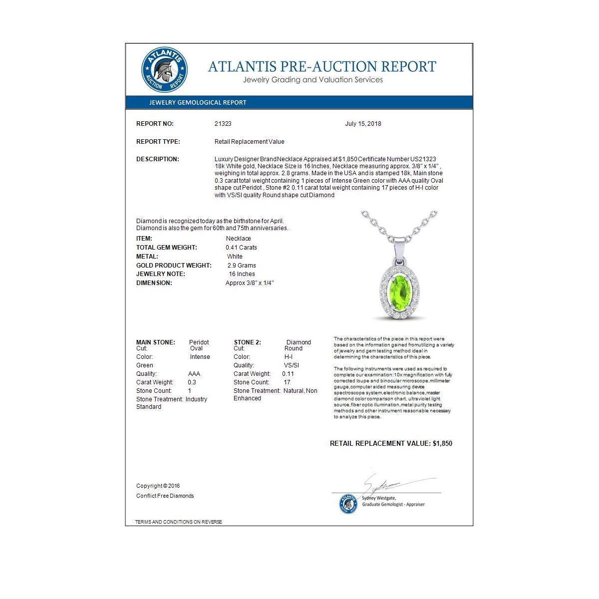 REF-26F2N -21323 ---- 0.41 CTW Peridot & Micro Pave VS/SI Diamond Necklace Halo 18K White Gold ---- Luxury Designer Brand Necklace Appraised at $1,850 Certificate Number US21323 18k White gold, Necklace Size is 16 Inches, Necklace measuring approx. 3/8" x 1/4" , weighing in total approx. 2.8 grams. Made in the USA and is stamped 18k, Main stone 0.3 carat total weight containing 1 pieces of Intense Green color with AAA quality Oval shape cut Peridot , Stone #2 0.11 carat total weight containing 17 pieces of H-I color with VS/SI quality Round shape cut Diamond