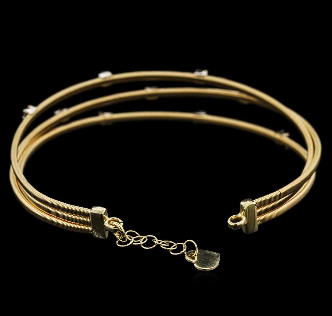 One electronically tested 14KT yellow gold lady's combination cast & assembled fashion bangle bracelet with a bright polished textured finish. The featured lady's cuff bangle bracelet has three braided wire-wrapped ribbons of gold measuring 6 millimeters in width. Identified with markings of "14K". Condition is new, good workmanship. Containing: Nine prong set round brilliant cut diamonds, measuring 2.30 - 2.25 x 1.44mm (depth est.) approximate total weight of 9 Stones = 0.41ct. Graded in the setting. Clarity: SI-2 to I-1. Color: G - H. Cut Good. Total Weight of Diamonds 0.41ct. Total Weight of Bangle Bracelet 14.00gm. GAS Appraised at $3,345.00.