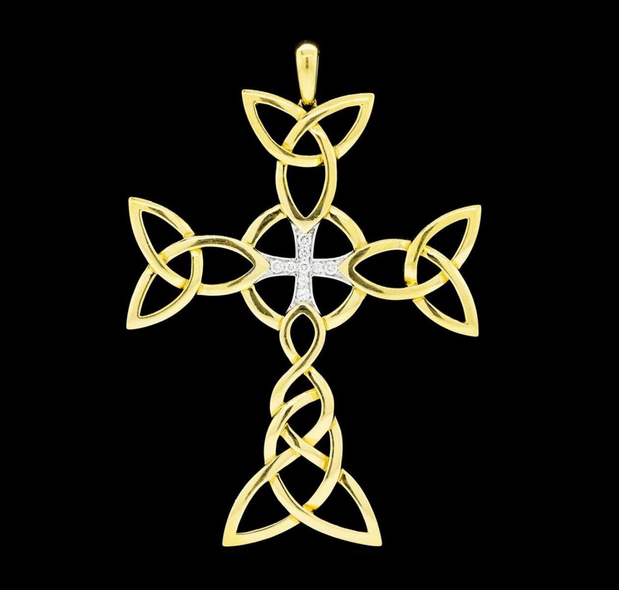 One electronically tested 18KT yellow with rhodium plating gold lady's combination cast & assembled fashion cross pendant with a bright polish finish. The featured cross pendant has a celtic knot motif and measures approximately three and a half inches in length. Identified with markings of '18K'. Condition is new, good workmanship. Containing: Five prong set round brilliant cut diamonds, measuring 2.50 - 2.40 x 1.52mm (depth est.) approximate total weight of 5 Stones = 0.28ct. Graded in the setting. Color H - I Clarity SI-1 to SI-2 Cut Very Good Four prong set round brilliant cut diamonds, measuring 2.10 - 2.00 x 1.27mm (depth est.) approximate total weight of 4 Stones = 0.13ct. Graded in the setting. Color H - I Clarity SI-1 to I-1 Cut Good. Total Weight of Diamonds 0.41ct.. Total Weight of Pendant 24.10gm GAS Appraised at $4420.00. GAS Appraised.
