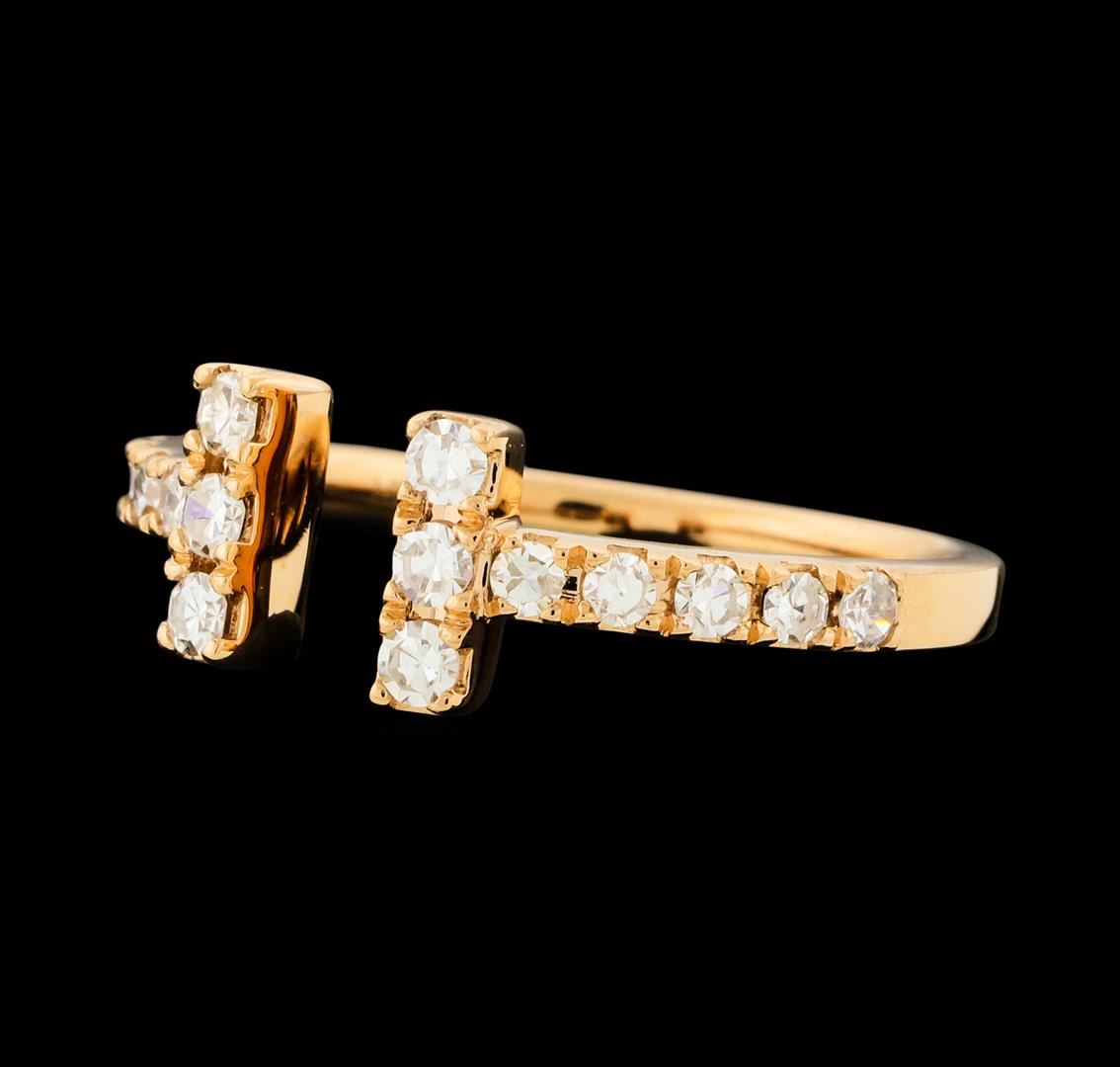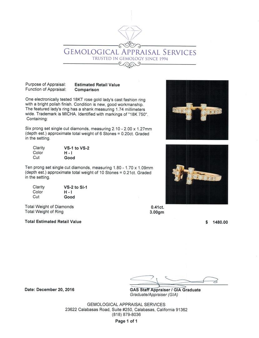 One electronically tested 18KT rose gold lady's cast fashion ring with a bright polish finish. The featured lady's ring has a shank measuring 1.74 millimeters wide. Trademark is MICHA. Identified with markings of '18K 750'. Condition is new, good workmanship. Containing: Six prong set single cut diamonds, measuring 2.10 - 2.00 x 1.27mm (depth est.) approximate total weight of 6 Stones = 0.20ct. Graded in the setting. Clarity VS-1 to VS-2. Color: H - I Cut Good Ten prong set single cut diamonds, measuring 1.80 - 1.70 x 1.09mm (depth est.) approximate total weight of 10 Stones = 0.21ct. Graded in the setting. Clarity VS-2 to SI-1. Color: H - I Cut Good. Total Weight of Diamonds 0.41ct.. Total Weight of Ring 3.00gm. GAS Appraised at $1,480.00.
