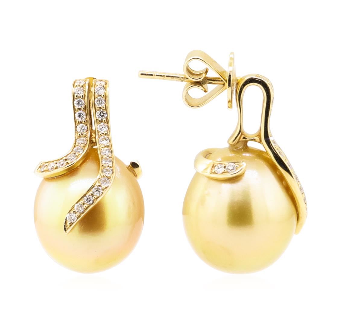 One pair electronically tested 14KT yellow gold lady's combination cast & assembled fashion earrings with heavy friction backs with a bright polish finish. Trademark is TARA T&S. Identified with markings of '14K'. Condition is like new, good workmanship. Containing: Two south sea cultured pearls, 15.0mm to 12.9mm in size. The pearls are golden in color with a very good luster, off round, and mostly clean with excellent matching. Graded in the setting. Fifty-Four prong set round brilliant cut diamonds, measuring 1.30 - 1.25 x 0.77mm (depth est.) approximate total weight of 54 Stones = 0.41ct. Graded in the setting. Color F - G Clarity VS-1 to VS-2 Cut Very Good. Total Weight of Diamonds 0.41ct.. Total Weight of Earrings 10.60gm GAS Appraised at $5425.00. GAS Appraised at $5,425.00.
