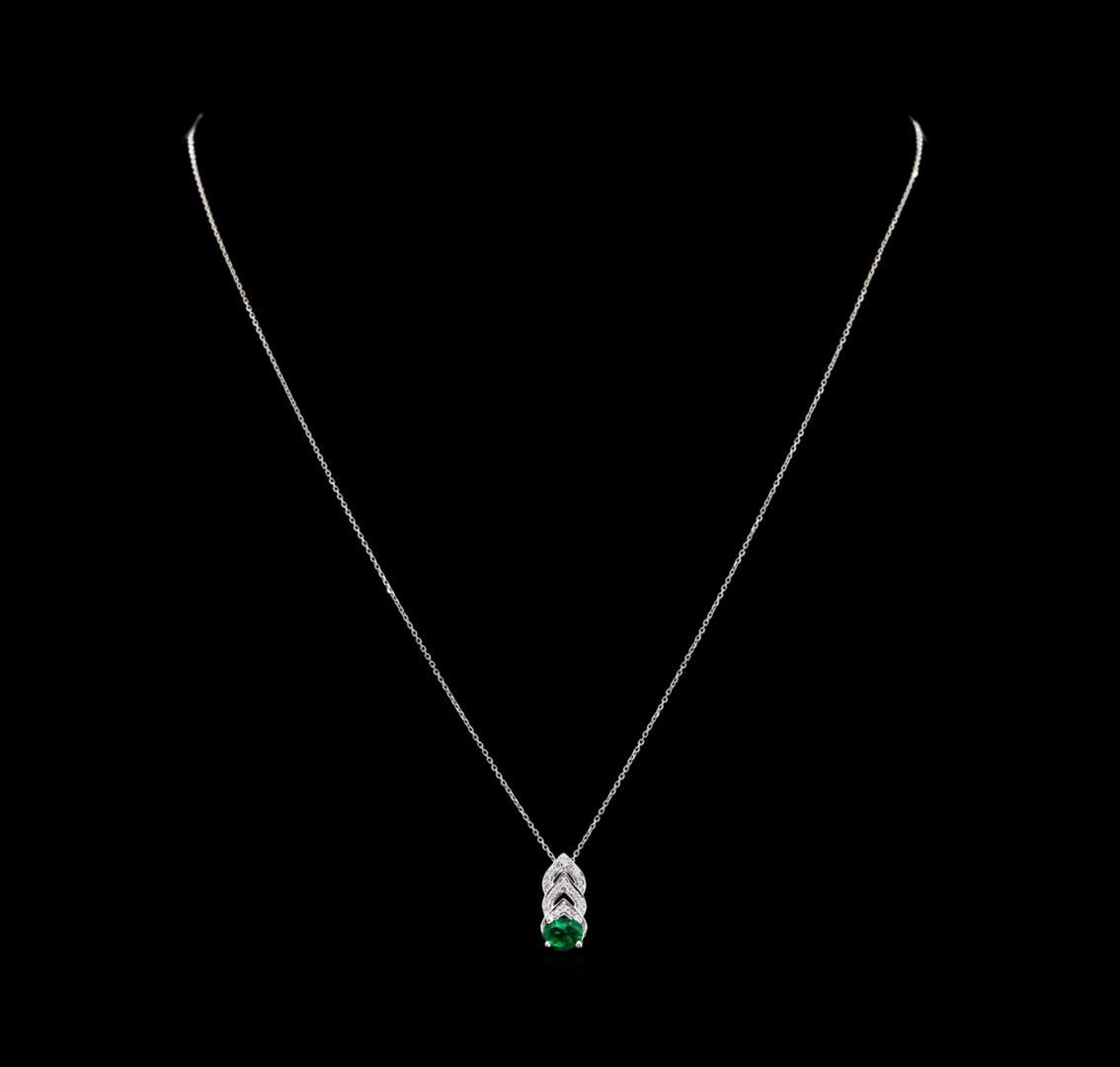 One electronically tested 14KT white gold ladies cast & assembled emerald and diamond pendant with chain. The pendant features an emerald completed by a stylized diamond bail. The pendant is supported by an eighteen inch length 14KT white gold designer style chain terminating in a spring ring clasp. Bright polish finish. Trademark is Orianne. Identified with markings of "14K". Condition is new, good workmanship. Containing: One prong set oval mixed cut natural emerald, measuring 5.60 x 4.10 x 3.00mm, approximate weight of 0.41ct., clarity is moderately included, type III, medium dark, moderately strong, bluish green color, (GIA bG 6/4), cut is good. Transmitting light with a minimum of distortion, transparent. Naturally occurring internal & external characteristics are present. Indications of oil residue. Graded in the setting. Twenty-Three prong set round brilliant cut diamonds approximate total weight of 23 Stones = 0.10ct. Graded in the setting. Clarity: I-1 to I-2. Color: G - I. Total Weight of Colored Stones 0.41ct. Total Weight of Diamonds 0.10ct. Total Weight of Pendant With Chain 1.97gm. AIG Appraised at $1,065.00.
