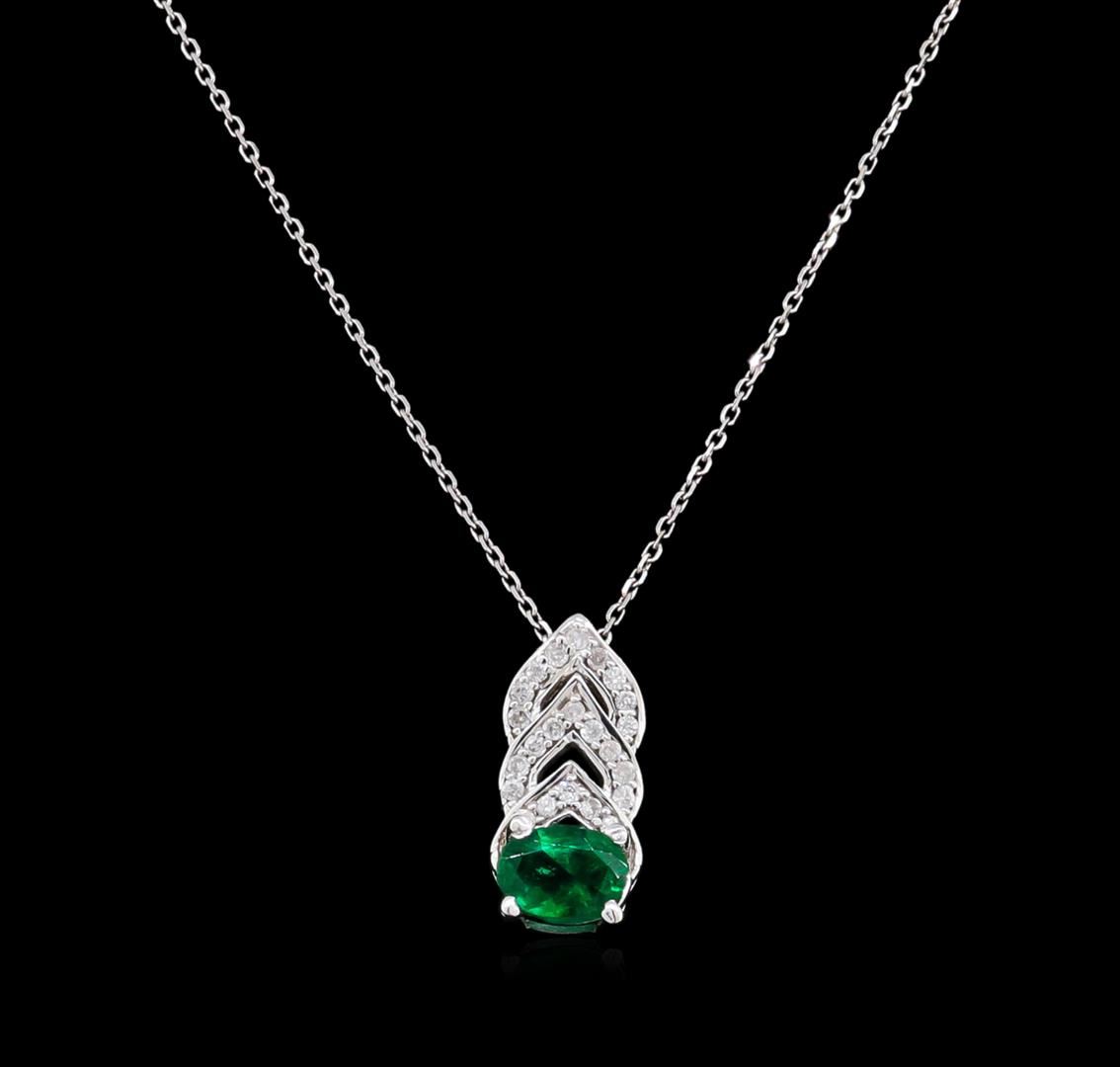 One electronically tested 14KT white gold ladies cast & assembled emerald and diamond pendant with chain. The pendant features an emerald completed by a stylized diamond bail. The pendant is supported by an eighteen inch length 14KT white gold designer style chain terminating in a spring ring clasp. Bright polish finish. Trademark is Orianne. Identified with markings of "14K". Condition is new, good workmanship. Containing: One prong set oval mixed cut natural emerald, measuring 5.60 x 4.10 x 3.00mm, approximate weight of 0.41ct., clarity is moderately included, type III, medium dark, moderately strong, bluish green color, (GIA bG 6/4), cut is good. Transmitting light with a minimum of distortion, transparent. Naturally occurring internal & external characteristics are present. Indications of oil residue. Graded in the setting. Twenty-Three prong set round brilliant cut diamonds approximate total weight of 23 Stones = 0.10ct. Graded in the setting. Clarity: I-1 to I-2. Color: G - I. Total Weight of Colored Stones 0.41ct. Total Weight of Diamonds 0.10ct. Total Weight of Pendant With Chain 1.97gm. AIG Appraised at $1,065.00.