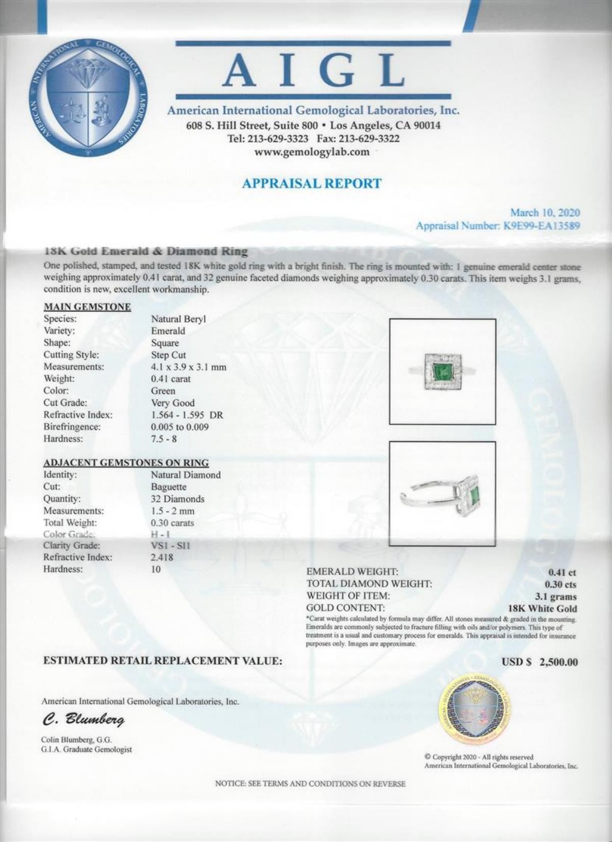 One 0.41ct Emerald and Diamond Ring - 18KT White Gold. AIG certified. See Appraisal for more details. AIG Appraised.
