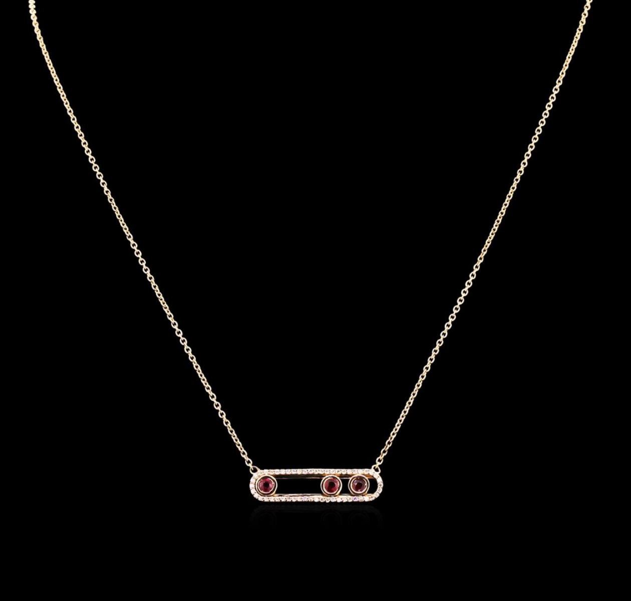 One necklace featuring: 14KT rose gold weighing 6.94 grams containing three rubies with a total weight of 0.41ct and 52 diamonds with a total weight of 0.27ct.