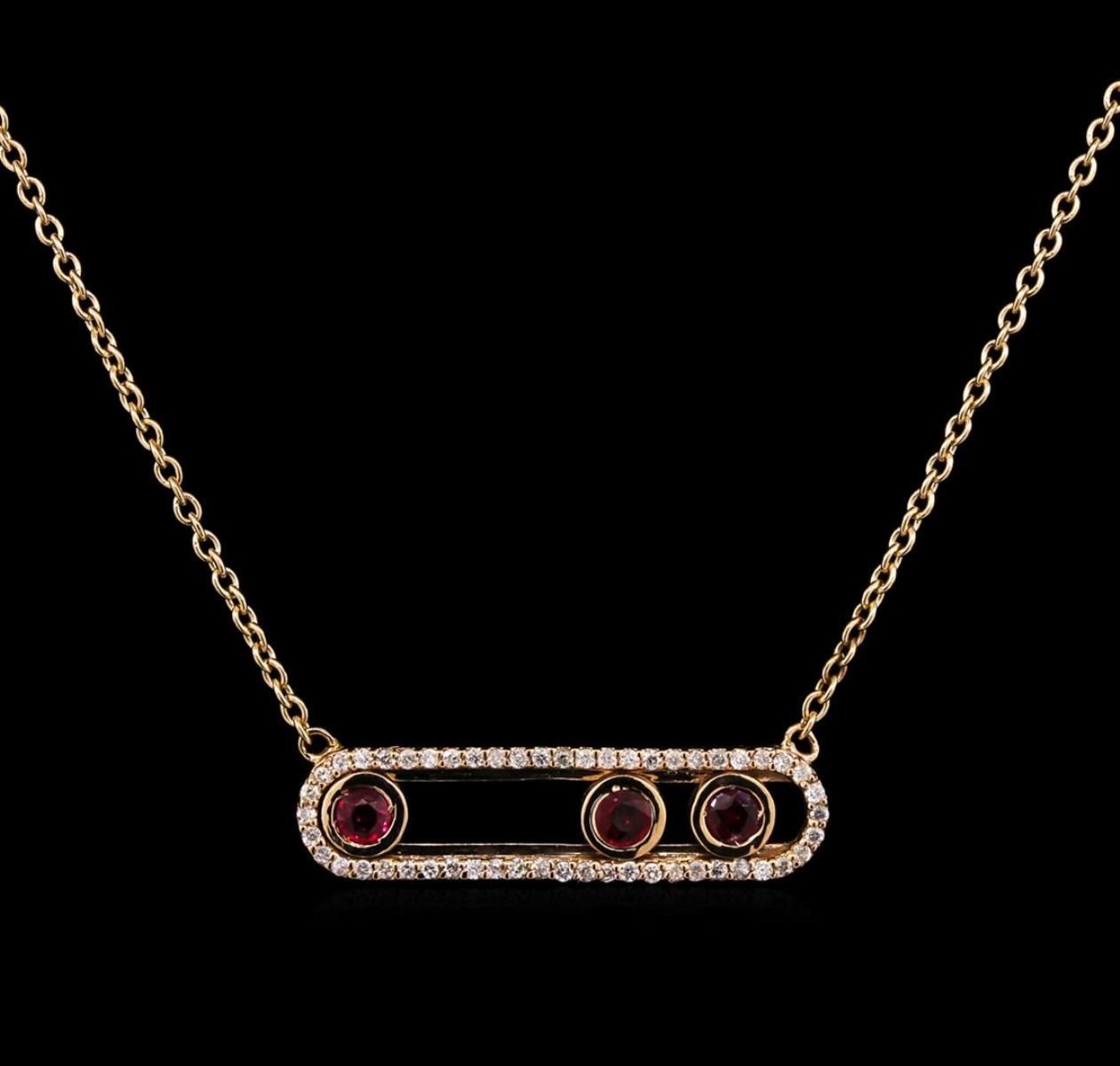 One necklace featuring: 14KT rose gold weighing 6.94 grams containing three rubies with a total weight of 0.41ct and 52 diamonds with a total weight of 0.27ct.