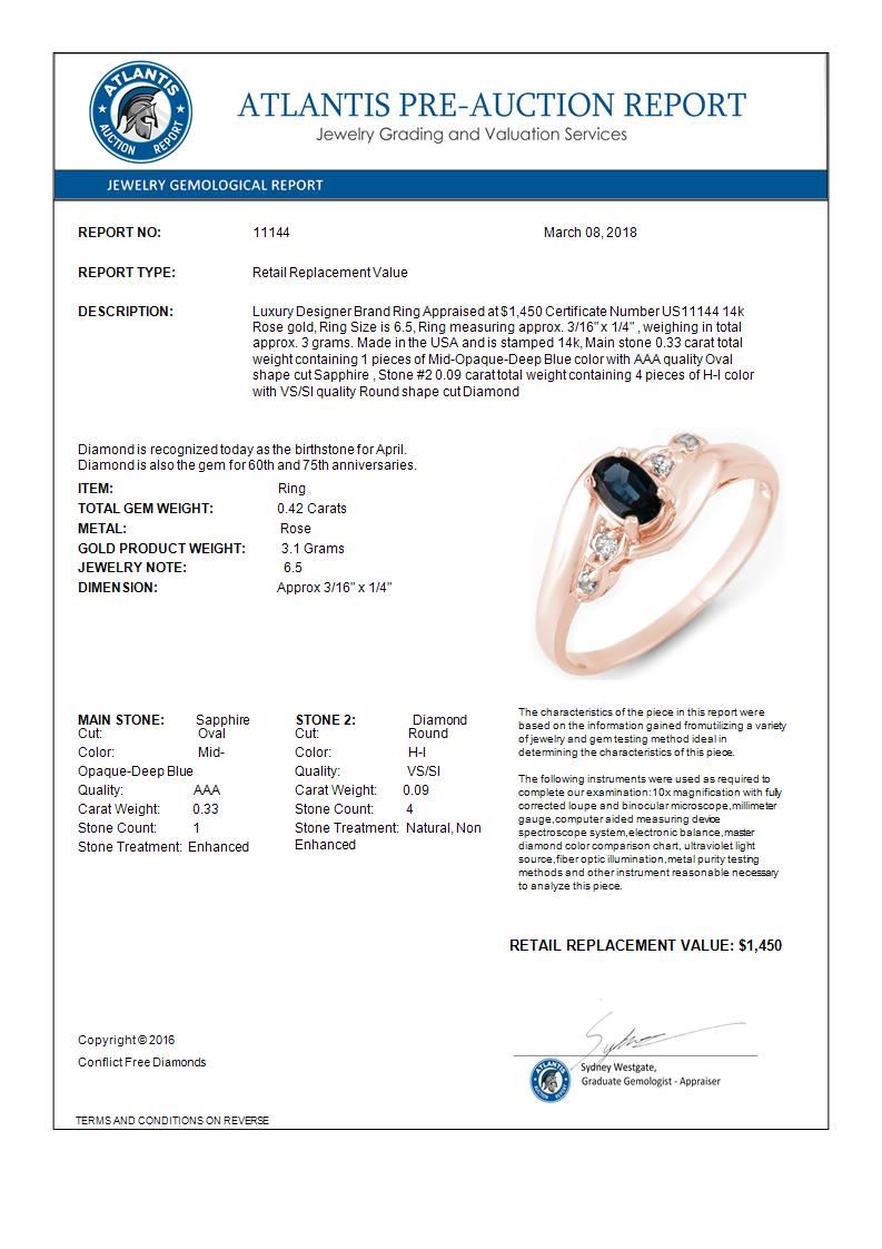 REF-24A2X -11144 ---- 0.42 CTW Blue Sapphire & Diamond Ring 14K Rose Gold ---- Luxury Designer Brand Ring Appraised at $1,450 Certificate Number US11144 14k Rose gold, Ring Size is 6.5, Ring measuring approx. 3/16" x 1/4" , weighing in total approx. 3 grams. Made in the USA and is stamped 14k, Main stone 0.33 carat total weight containing 1 pieces of Mid-Opaque-Deep Blue color with AAA quality Oval shape cut Sapphire , Stone #2 0.09 carat total weight containing 4 pieces of H-I color with VS/SI quality Round shape cut Diamond