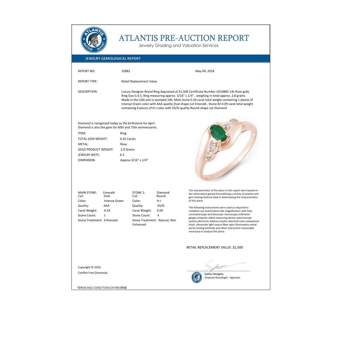 REF-23N3Y -10982 ---- 0.42 CTW Emerald & Diamond Ring 14K Rose Gold ---- Luxury Designer Brand Ring Appraised at $1,500 Certificate Number US10982  14k Rose gold,  Ring Size is 6.5, Ring measuring approx. 3/16" x  1/4" , weighing in total approx. 2.8 grams. Made in the USA and is stamped 14k, Main stone 0.33 carat total weight containing 1 pieces of Intense Green color with AAA quality Oval shape cut Emerald , Stone #2 0.09 carat total weight containing 4 pieces of H-I color with  VS/SI quality Round shape cut Diamond