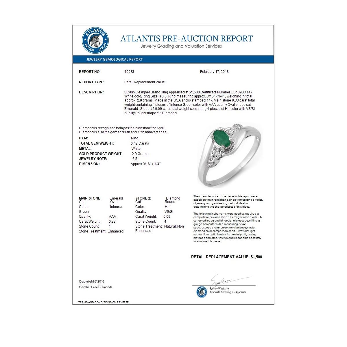 REF-23X3T -10983 ---- 0.42 CTW Emerald & Diamond Ring 14K White Gold ---- Luxury Designer Brand Ring Appraised at $1,500 Certificate Number US10983 14k White gold, Ring Size is 6.5, Ring measuring approx. 3/16" x 1/4" , weighing in total approx. 2.8 grams. Made in the USA and is stamped 14k, Main stone 0.33 carat total weight containing 1 pieces of Intense Green color with AAA quality Oval shape cut Emerald , Stone #2 0.09 carat total weight containing 4 pieces of H-I color with VS/SI quality Round shape cut Diamond