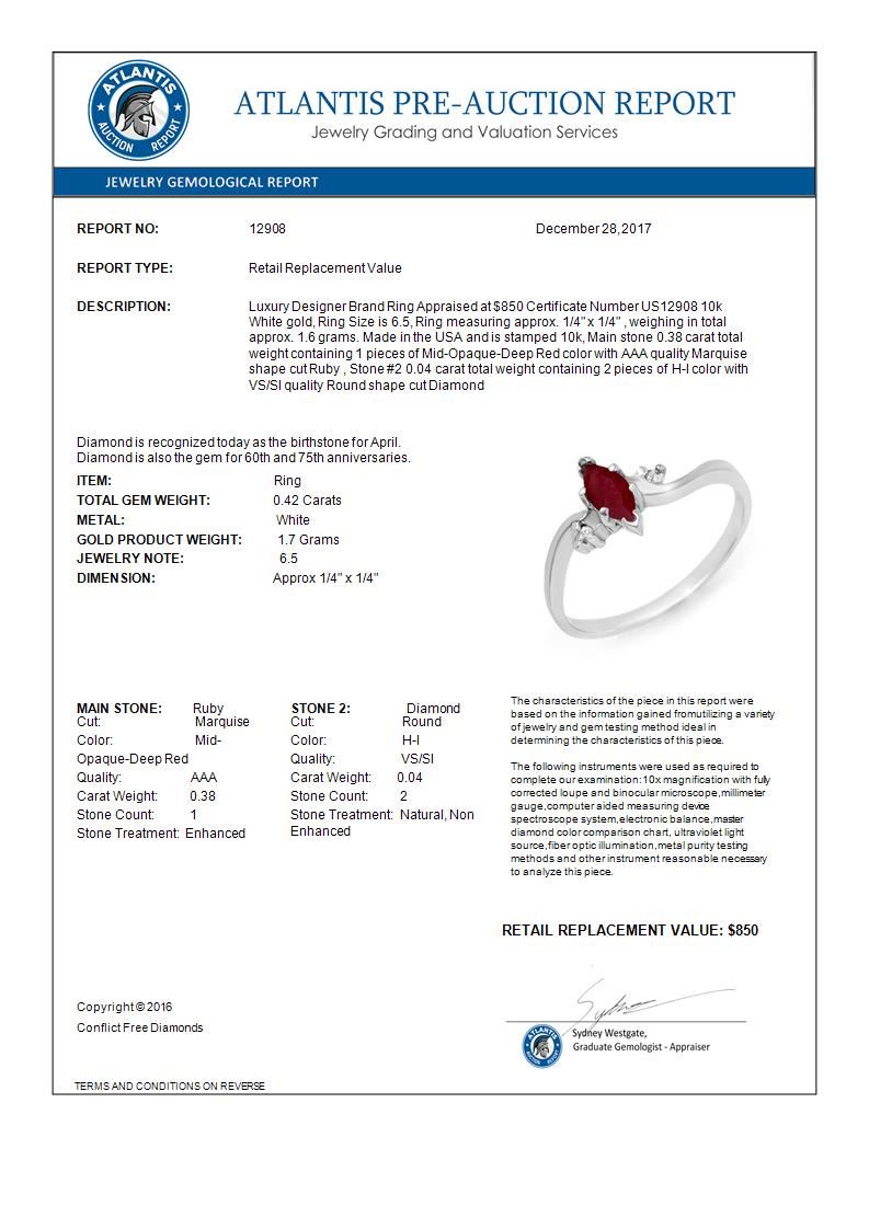 REF-13X3T -12908 ---- 0.42 CTW Ruby & Diamond Ring 10K White Gold ---- Luxury Designer Brand Ring Appraised at $850 Certificate Number US12908 10k White gold, Ring Size is 6.5, Ring measuring approx. 1/4" x 1/4" , weighing in total approx. 1.6 grams. Made in the USA and is stamped 10k, Main stone 0.38 carat total weight containing 1 pieces of Mid-Opaque-Deep Red color with AAA quality Marquise shape cut Ruby , Stone #2 0.04 carat total weight containing 2 pieces of H-I color with VS/SI quality Round shape cut Diamond