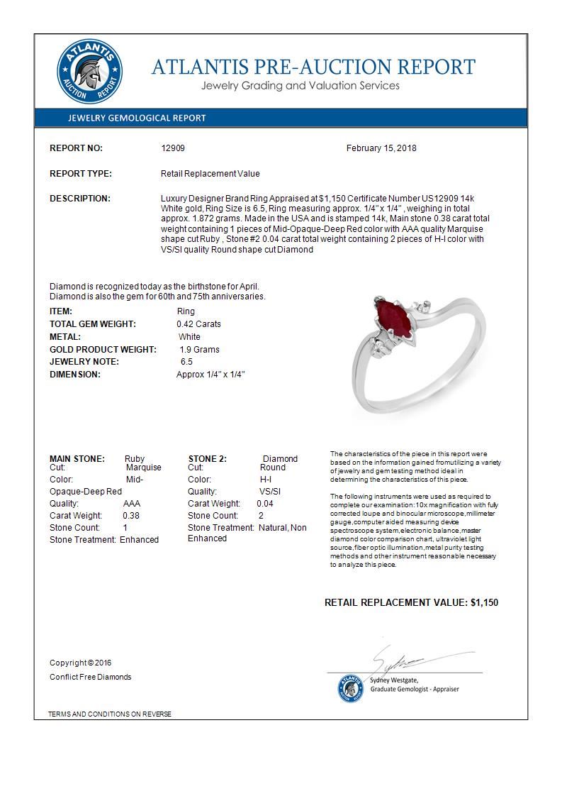 REF-17F5N -12909 ---- 0.42 CTW Ruby & Diamond Ring 14K White Gold ---- Luxury Designer Brand Ring Appraised at $1,150 Certificate Number US12909 14k White gold, Ring Size is 6.5, Ring measuring approx. 1/4" x 1/4" , weighing in total approx. 1.872 grams. Made in the USA and is stamped 14k, Main stone 0.38 carat total weight containing 1 pieces of Mid-Opaque-Deep Red color with AAA quality Marquise shape cut Ruby , Stone #2 0.04 carat total weight containing 2 pieces of H-I color with VS/SI quality Round shape cut Diamond