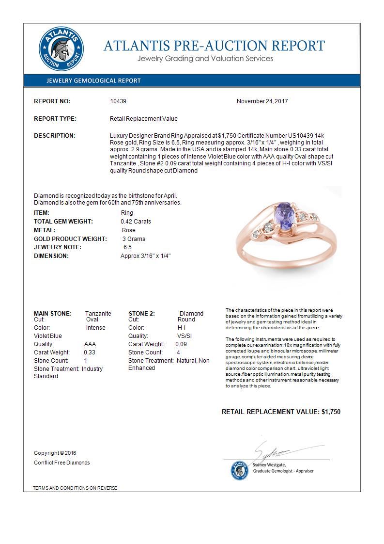 REF-24W2F -10439 ---- 0.42 CTW Tanzanite & Diamond Ring 14K Rose Gold ---- Luxury Designer Brand Ring Appraised at $1,750 Certificate Number US10439 14k Rose gold, Ring Size is 6.5, Ring measuring approx. 3/16" x 1/4" , weighing in total approx. 2.9 grams. Made in the USA and is stamped 14k, Main stone 0.33 carat total weight containing 1 pieces of Intense Violet Blue color with AAA quality Oval shape cut Tanzanite , Stone #2 0.09 carat total weight containing 4 pieces of H-I color with VS/SI quality Round shape cut Diamond