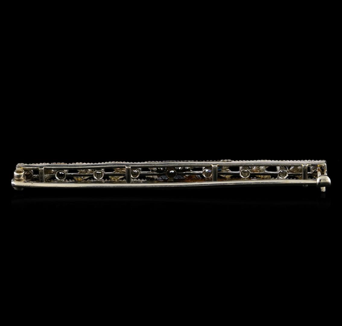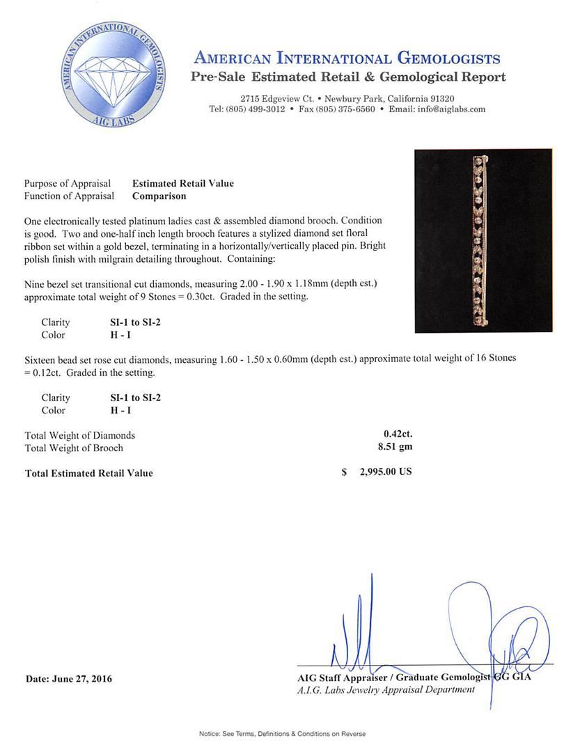 One electronically tested platinum ladies cast & assembled diamond brooch. Two and one-half inch length brooch features a stylized diamond set floral ribbon set within a gold bezel, terminating in a horizontally/vertically placed pin. Bright polish finish with milgrain detailing throughout. Condition is good. Containing: Nine bezel set transitional cut diamonds, measuring 2.00 - 1.90 x 1.18mm (depth est.) approximate total weight of 9 Stones = 0.30ct. Graded in the setting. Clarity: SI-1 to SI-2. Color: H - I Sixteen bead set rose cut diamonds, measuring 1.60 - 1.50 x 0.60mm (depth est.) approximate total weight of 16 Stones = 0.12ct. Graded in the setting. Clarity: SI-1 to SI-2. Color: H - I. Total Weight of Diamonds 0.42ct. Total Weight of Brooch 8.51gm. AIG Appraised at $2,995.00.