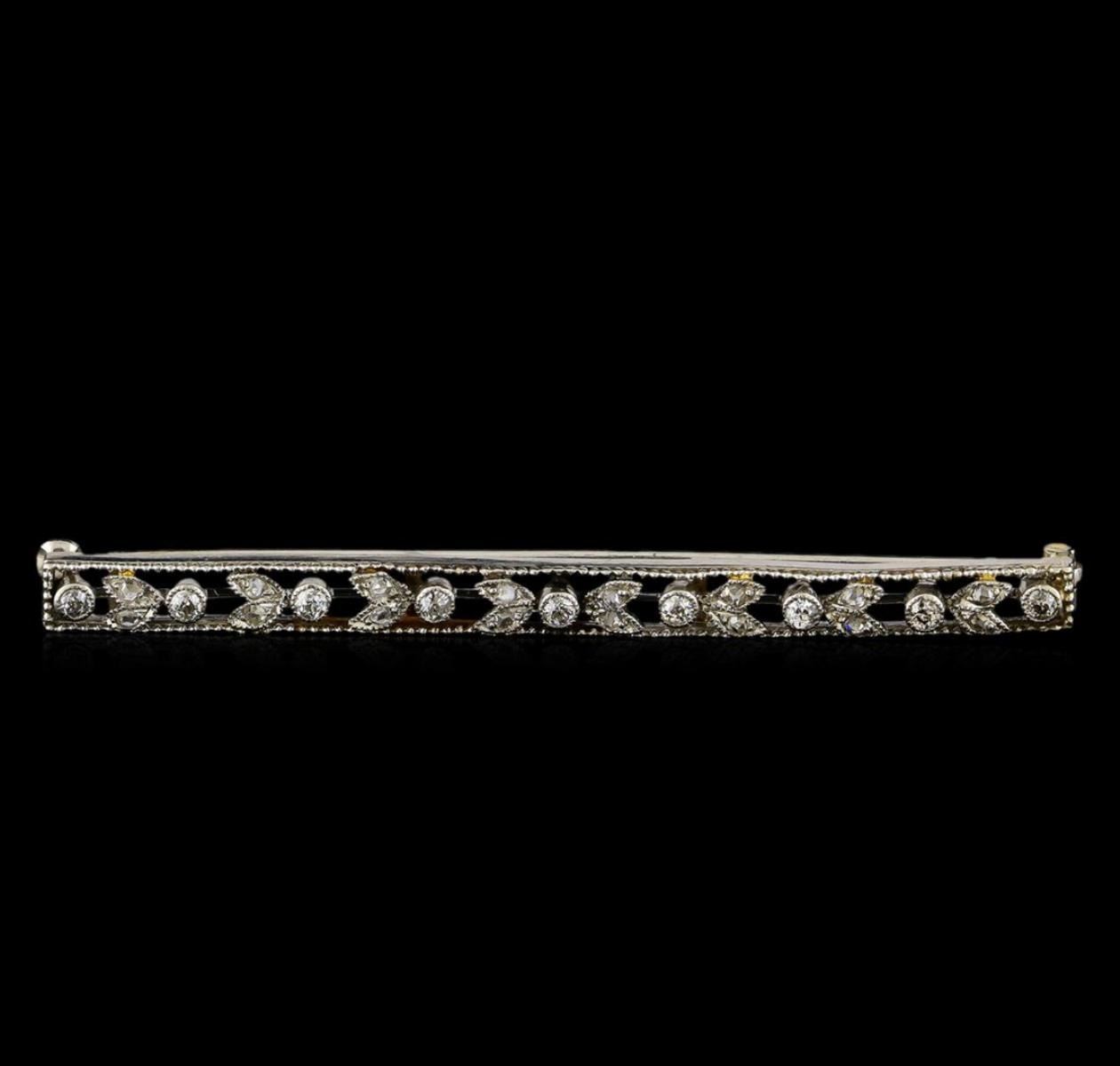 One electronically tested platinum ladies cast & assembled diamond brooch. Two and one-half inch length brooch features a stylized diamond set floral ribbon set within a gold bezel, terminating in a horizontally/vertically placed pin. Bright polish finish with milgrain detailing throughout. Condition is good. Containing: Nine bezel set transitional cut diamonds, measuring 2.00 - 1.90 x 1.18mm (depth est.) approximate total weight of 9 Stones = 0.30ct. Graded in the setting. Clarity: SI-1 to SI-2. Color: H - I Sixteen bead set rose cut diamonds, measuring 1.60 - 1.50 x 0.60mm (depth est.) approximate total weight of 16 Stones = 0.12ct. Graded in the setting. Clarity: SI-1 to SI-2. Color: H - I. Total Weight of Diamonds 0.42ct. Total Weight of Brooch 8.51gm. AIG Appraised at $2,995.00.