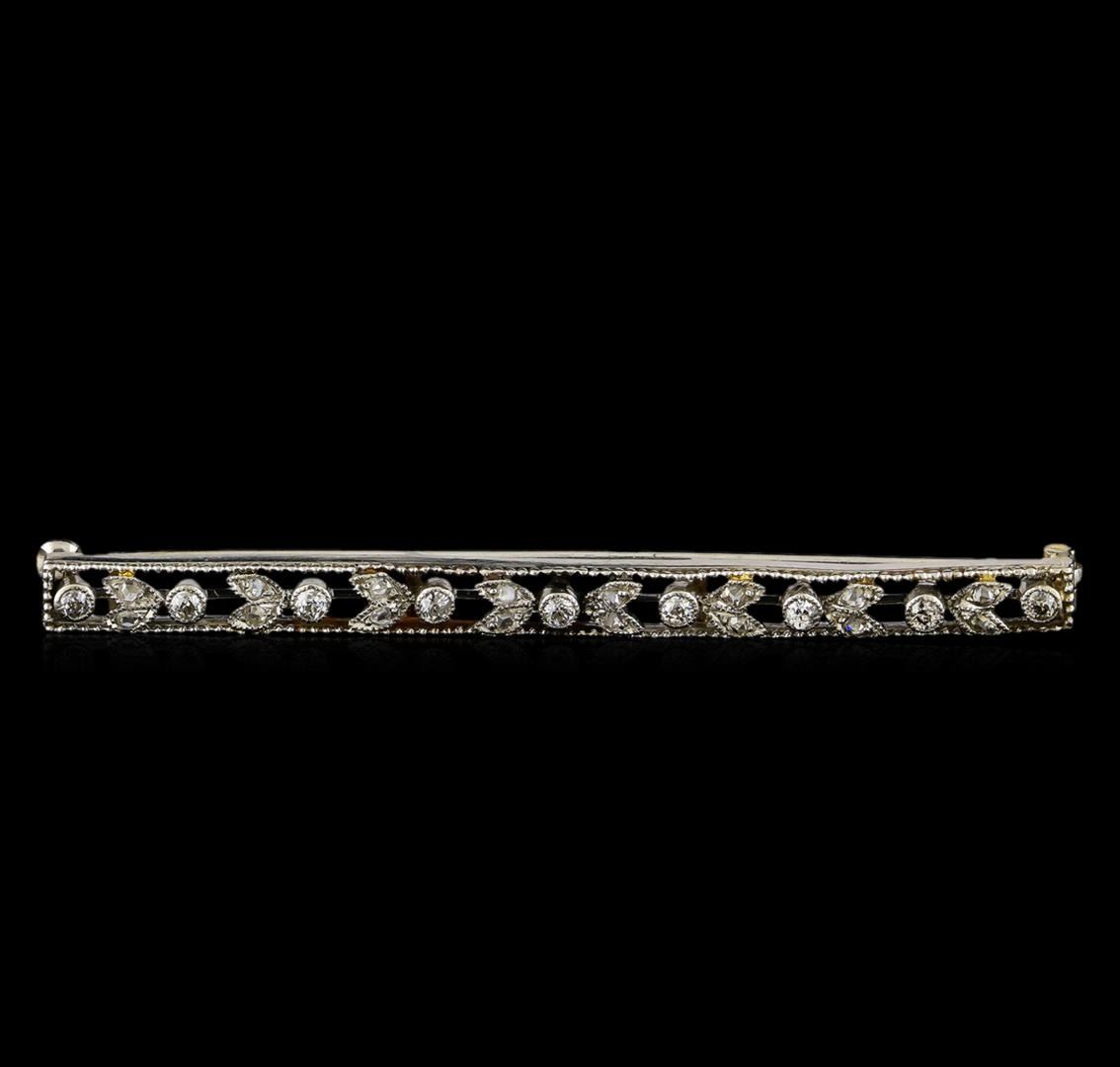 One electronically tested platinum ladies cast & assembled diamond brooch. Two and one-half inch length brooch features a stylized diamond set floral ribbon set within a gold bezel, terminating in a horizontally/vertically placed pin. Bright polish finish with milgrain detailing throughout. Condition is good. Containing: Nine bezel set transitional cut diamonds, measuring 2.00 - 1.90 x 1.18mm (depth est.) approximate total weight of 9 Stones = 0.30ct. Graded in the setting. Clarity: SI-1 to SI-2. Color: H - I Sixteen bead set rose cut diamonds, measuring 1.60 - 1.50 x 0.60mm (depth est.) approximate total weight of 16 Stones = 0.12ct. Graded in the setting. Clarity: SI-1 to SI-2. Color: H - I. Total Weight of Diamonds 0.42ct. Total Weight of Brooch 8.51gm. AIG Appraised.