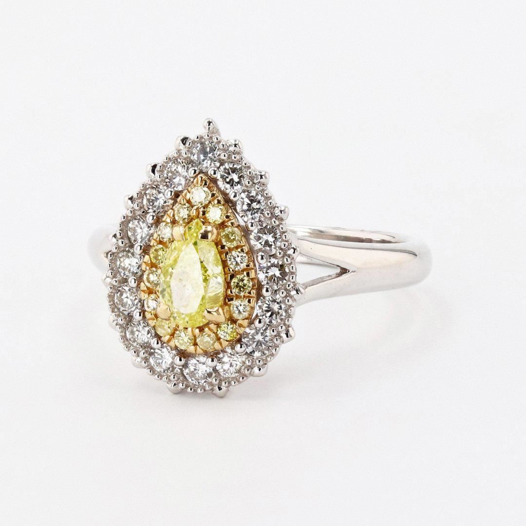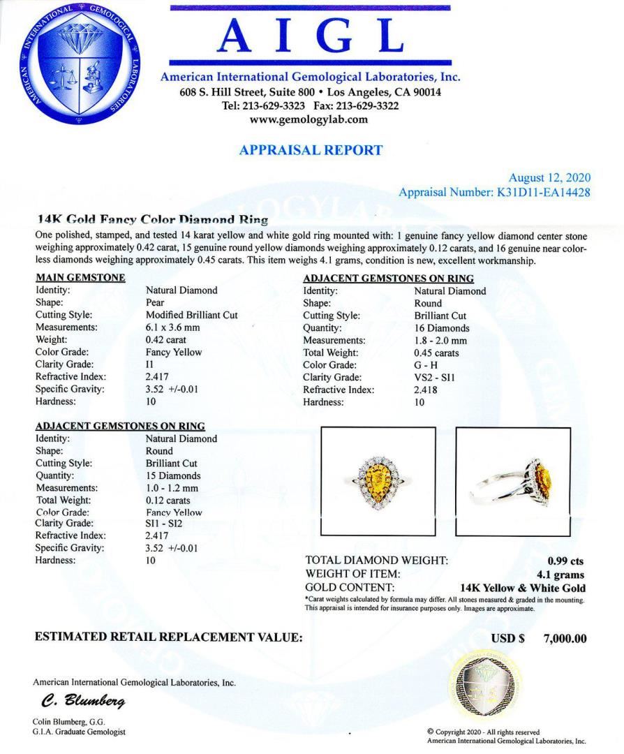 One polished, stamped, and tested 14 karat yellow and white gold ring mounted with: 1 genuine fancy yellow diamond center stone weighing approximately 0.42 carat, 15 genuine round yellow diamonds weighing approximately 0.12 carats, and 16 genuine near colorless diamonds weighing approximately 0.45 carats. This item weighs 4.1 grams, condition is new, excellent workmanship. MAIN GEMSTONE Identity: Natural Diamond Shape: Pear Cutting Style: Modified Brilliant Cut Measurements: 6.1mm x 3.6mm Weight: 0.42 carat Color Grade: Fancy Yellow Clarity Grade: I1 Refractive Index: 2.417 Specific Gravity: 3.52 +/-0.01 Hardness: 10 ADJACENT GEMSTONES ON RING Identity: Natural Diamond Shape: Round Cutting Style: Brilliant Cut Quantity: 15 Diamonds Measurements: 1.0mm to 1.2mm Total Weight: 0.12 carats Color Grade: Fancy Yellow Clarity Grade: SI1 to SI2 Refractive Index: 2.417 Specific Gravity: 3.52 +/-0.01 Hardness: 10 ADJACENT GEMSTONES ON RING Identity: Natural Diamond Shape: Round Cutting Style: Brilliant Cut Quantity: 16 Diamonds Measurements: 1.8mm to 2.0mm Total Weight: 0.45 carats Color Grade: G - H Clarity Grade: VS2 to SI1 Refractive Index: 2.418 Hardness: 10 TOTAL DIAMOND WEIGHT: 0.99 cts WEIGHT OF ITEM: 4.1 grams GOLD CONTENT: 14K Yellow and White Gold #LREF-3111