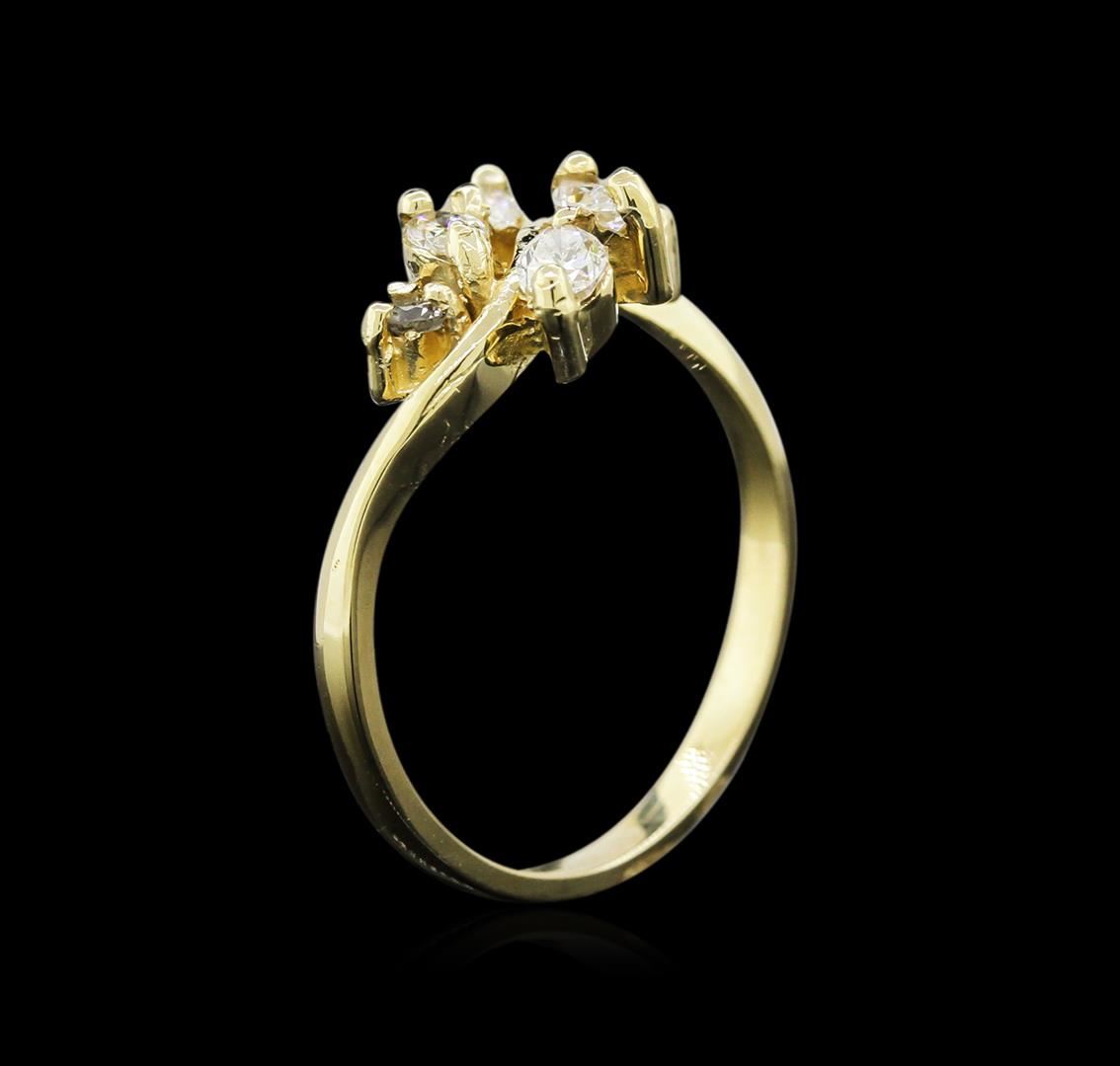 One electronically tested 14KT yellow gold lady's cast fashion ring with a bypass shank with a bright polish finish. The featured lady's ring has a shank measuring 1.85 millimeters in width. Identified with markings of "14K". Condition is new, good workmanship. Containing: Four prong set marquise shaped cut diamonds, measuring 4.00 x 2.50 x 1.57mm (depth est.) approximate total weight of 4 Stones = 0.36ct. Graded in the setting. Clarity: SI-1 to SI-2. Color: H - I. Cut Good Two prong set round brilliant cut diamonds, measuring 2.20 - 2.10 x 1.29mm (depth est.) approximate total weight of 2 Stones = 0.07ct. Graded in the setting. Clarity: I-1. Color: J - Good. Total Weight of Diamonds 0.43ct. Total Weight of Ring 2.20gm. GAS Appraised at $1,485.00.